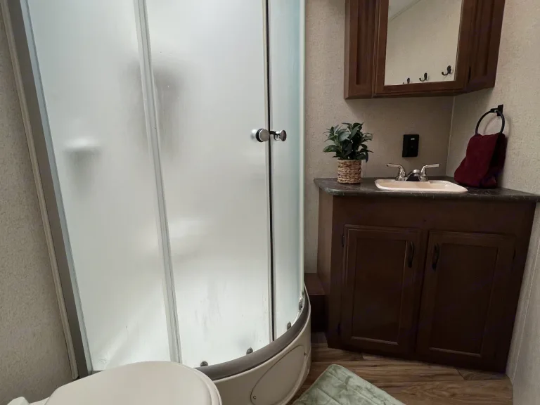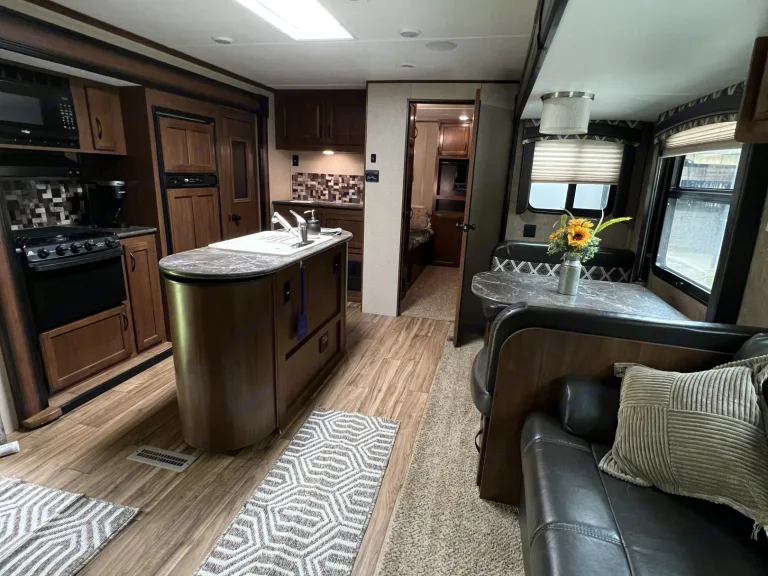 Sleeps 8 comfortably, travel trailer includes memory foam queen bed, 2 fold out sofas, convertible dinette and bunk beds.