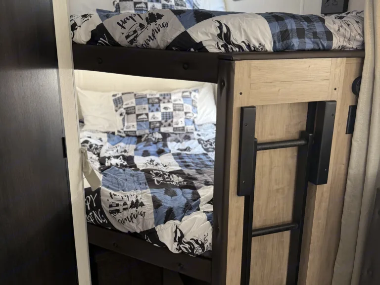 Cozy RV rental bunk beds with a ladder. Blue/white camping-themed bedding, a small window, and light wood interior.. Forest River Grey wolf 2026