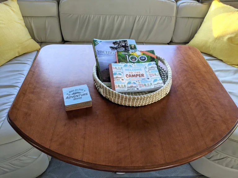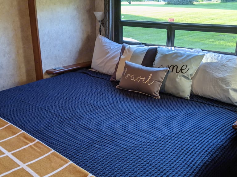 Meet "Harvey the RV!" This wonderful GAS home on wheels has been sanitized and is available for you to make your next vacation memory in, and includes a Rec Pass so you can go to any Michigan State Park/State Recreation areas for no charge. With a modern and updated look we hope you feel welcomed. We tried to include most of the must-have's and wants so you don't have to pack it-we've stocked it with dishes, utensils, condiments, pots & pans, grilling supplies, extra pillows/linens, towels, camping chairs, board games, dvds, books, and more! Our goal is to make this Easy for our renting friends so you can focus on having fun with your family and friends. We even provided some little extras and gifts for you! There is tons of storage inside and out. The wide living space has two full room slide outs, and a large master bedroom that features a third slide out. The kitchen is expansive, has beautiful cherry cabinets, solid surface counters, extra large side by side fridge/freezer for all your food and beverages, gas range and a microwave/convection oven for your cooking needs. The entertainment includes three TV's and Amazon Fire Stick so you can log into your own streaming services OR watch from the included antenna TV. Enjoy the upgraded king size memory foam mattress in master bedroom. Additional sleeping via fold out couch, "jackknife" style couch, and drop down dinette. Sleeps comfortably 6 adults but even more with some kiddos. Other features: spacious compartmentalized bathroom and washer/dryer unit included, generator, 2 zone AC's, retractable power awning. Harvey features Full hookups so as long as you're parked at a spot with water, sewer and electric, you are set for as long as you need to be there.We worked hard to make this RV rental as turn key as possible and are confident that you will enjoy your stay in this beautiful, easy to drive motorhome! Please write us with any questions, we are happy to answer and help you to make your vacation amazing!Was ist inbegriffenHand sanitizer, State Rec Pass, backup camera, utensils, dishes-plates, serving ware, cups, glasses, bowls, coffee mugs, wine glasses, silverware, coffee pot and coffee, toaster, condiments, pots & pans, resealable bags, paper towel and additional kitchen needs, grilling supplies, picnic area outdoor rug, camping forks, LED camping lights, and portable serving/dining table, extra pillows/linens/blankets, towels, toilet paper, camping chairs, board games, puzzles, dvds, books/magazines, all necessary hoses, electrical cords and leveling blocks.EmpfehlungenPlease email us for a link to easy how-to instructional videos of our Harvey. [email removed]Weitere wichtige DingePlease pay attention to our Rules of the Road section and Add-On's prior to renting.