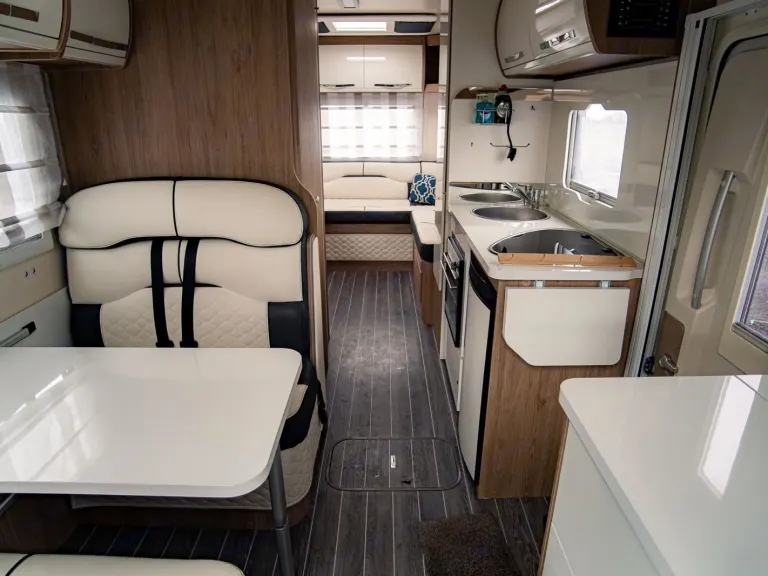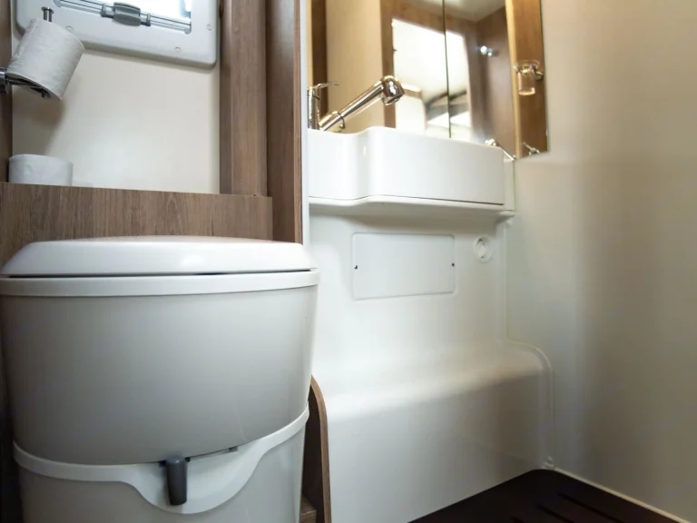 Inside, you’ll find six comfortable sleeping berths, a well-designed living area, and a fully equipped kitchen with hob, fridge/freezer, and sink, making meals on the road simple and enjoyable. The bathroom includes a shower, toilet, and washbasin, giving you the freedom to travel without relying on campsite facilities.