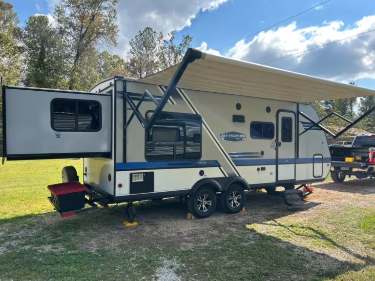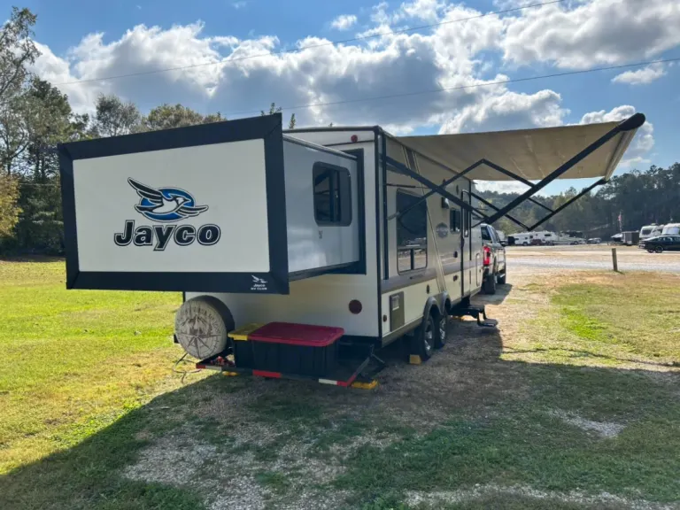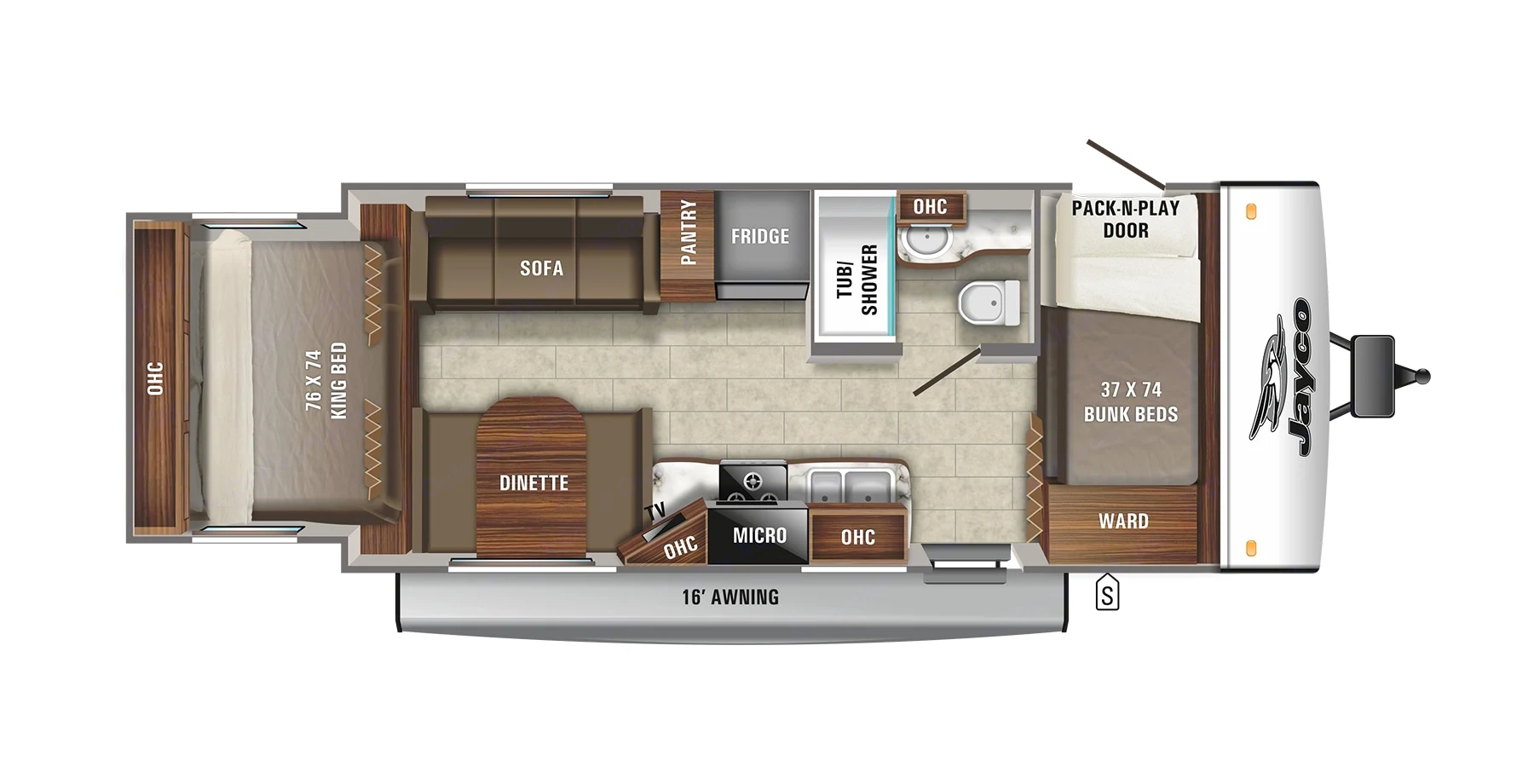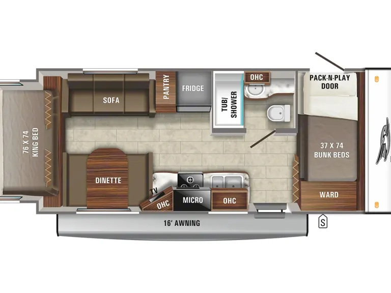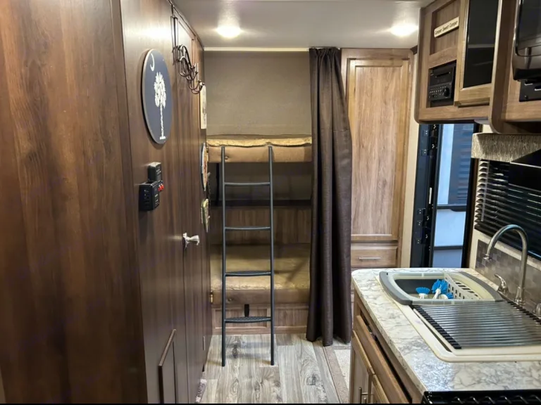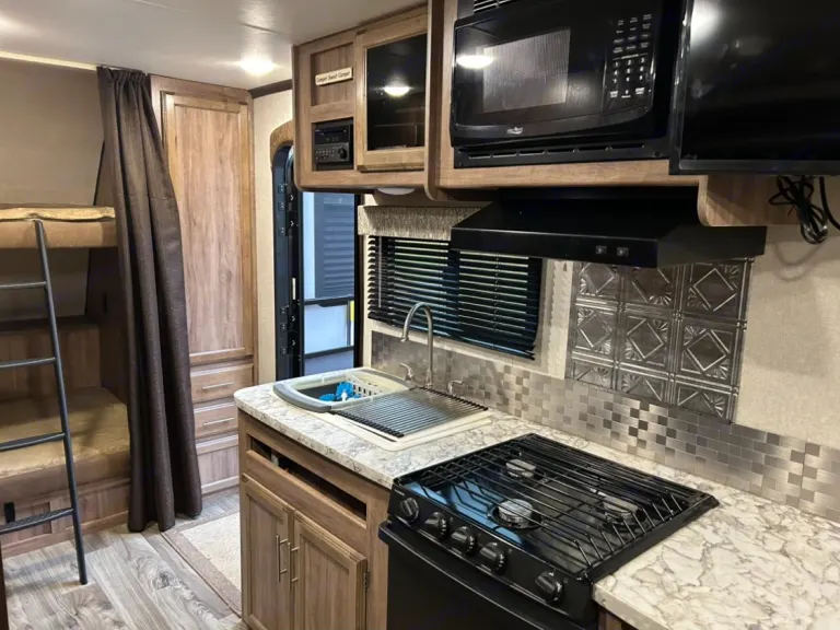 Spacious king-bed bunkhouse in a lightweight trailer! Easy tow, great storage, sleeps 6, and includes everything you need for a hassle-free getaway.Spacious King Slide-Out Bed with premium mattressTwin Bunk Beds with privacy curtainConvertible Dinette for extra sleeping spaceFull Kitchen:3-burner stoveOvenMicrowaveDouble sinkRefrigerator/freezerEntertainment: TV hookup, stereo with indoor/outdoor speakersClimate Control: A/C and furnace to keep you comfortable year-roundBathroom:Shower and tub (great for kids!)Foot-flush toiletVanity and mirror