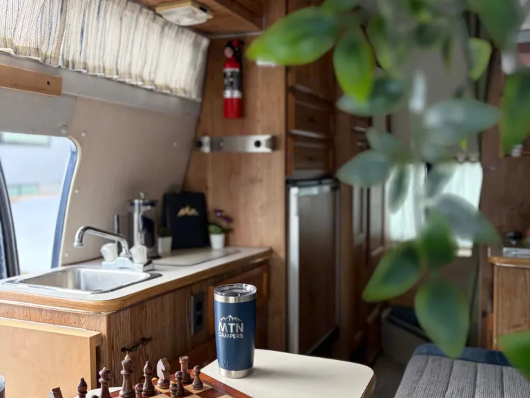 Rest & Warmth: We know that a good adventure requires good rest. Harvie features a dedicated fold-out double bed with plush cushioning that many guests find more comfortable than a hotel mattress. Because nights in the Rockies can get chilly, the interior is equipped with a thermostat-controlled propane furnace to keep you toasty warm without needing to run the engine. You can sleep soundly with blackout curtains for total privacy, and utilize the massive overhead loft to store your backpacks and gear out of the way.