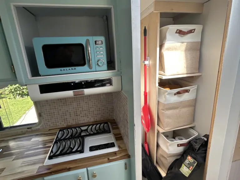 For quick meals and reheats, the bigblackcamper also comes with a brand new microwave and toaster as well (avail on 110v powered plug-in only)Hot water is also included with a 6gal propane electric tank that runs off either 110v power or off-grid solar.Refrigerator/freezer combo as well as the furnace are also propane/12v-110v combo units. Making powered site camping easy as well as making off grid adventures feel luxurious.Also included is a small outdoor propane bbq grill/1 burner combo stove.The washroom has been fully renovated top to bottom with new toilet, sink, tile, flooring and lighting.