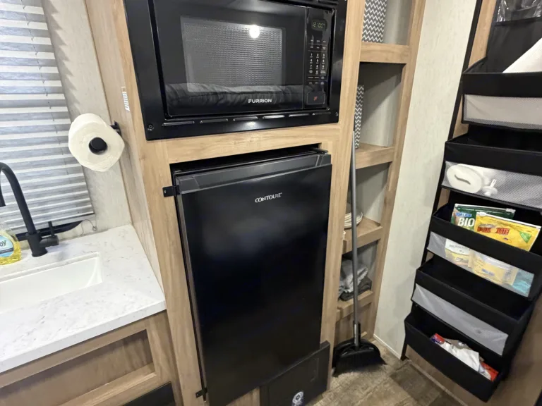 • Full kitchen amenities — cooktop, fridge, microwave, storage