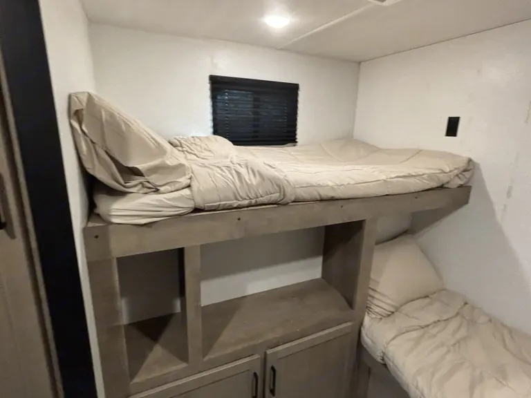 • Private bunk room – Features multiple bunks and flip-out cushions, giving kids or guests their own space to relax.