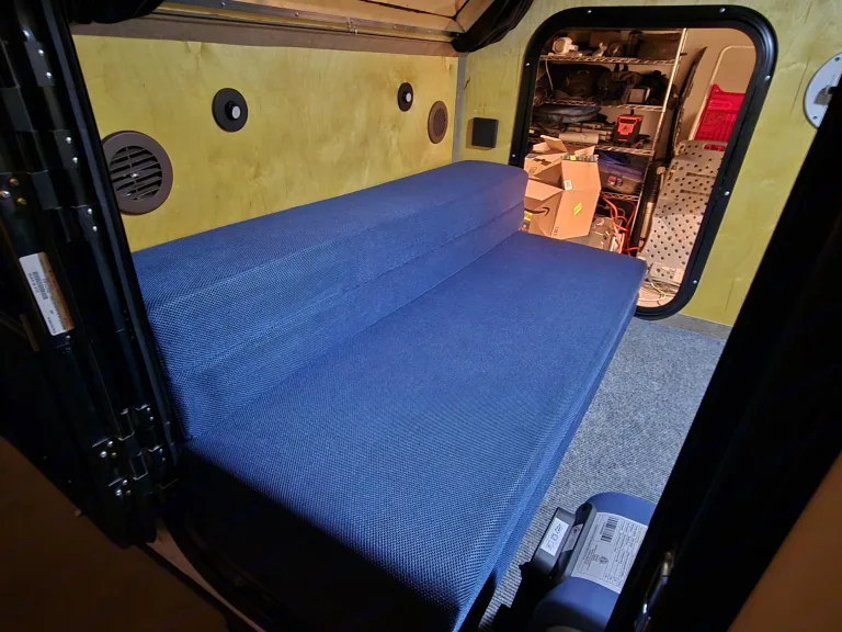 -in tall and will fit down most forest roads. It comfortably sleeps 4 adults (plus 1 child), and has room inside cabin for 2-3 adults to be able to comfortably sit on the couch, also has a galley style kitchen out back with stainless steel countertop and sink, as well as a mountable table that extends shelf space. We also provide a fridge and freezer combo that is all runs off a 300 amp hour battery, that has 150 watts of solar to supplement recharge. There is also a 1000w inverter for all 110v appliances. We provide all basic amenities like stove/propane fuel, kitchen utensils/pots and pans. We do have a optional air conditioner for rent, as well as a diesel heater to allow for comfortable nights no matter the season. The roof top tent allows for optional storage expansion, or sleeps 2 more people. Can access roof top tent bunk bed from pass through inside trailer, or by climbing ladder on side of trailer. Also has 9 feet of vertical clearance standing up inside trailer for tall people when getting dressed. Room for storage on front of trailer for bikes, extras coolers, large propane, plenty of chairs, etc. as well as storage on top of trailer roof bars. (100lbs max roof storage)You'll be able to live light and right on the land, while minimalistic camping, but keeping a reliable power source to bring your star link and stay connected if need be. Enjoy a reliable comfortable, warm/cool, and dry place instead of roughing it. This trailer is the perfect camp set up for days on the land.As long as your vehicle has at least 2500lbs tow capacity(1950 dry weight, 2400-2500 Fully loaded), any car can take this (and your family) anywhere! We also have trailer brakes that work with any vehicle.(You are responsible for your own bedding. Sheets, pillows, sleeping bags/blankets and toiletries) Was ist inbegriffen• Utelsiles