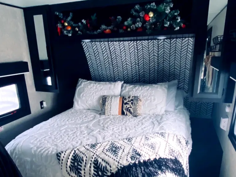 A comfortable queen master, double bunk beds, and a convertible dinette/sofa sleep up to 8 guests. The full kitchen includes a fridge, microwave, stove, and all the cookware you’ll need to whip up meals after a day of exploring. Ice-cold A/C, cozy heat, and smart storage make every trip feel effortless.