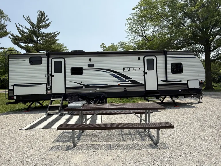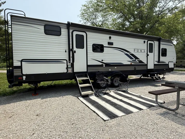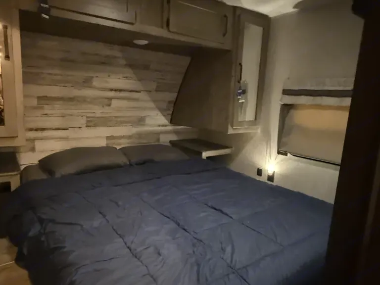 Great family camper or plenty of space for a couples getaway. Camper is complete with all utensils and amended needed to have a great camping experience. Camper will sleep up to 10 but 7-8 is very comfortable. 20 foot slide allows for plenty of room in living area. Has private queen bed room, private bunk room with triple bunk beds in the back with table and couch also folds out into full size beds as well. Large awning will allow you fun outdoors no matter the conditions. Camper is equipped with chairs and outdoor/indoor cooking utensils. Included is pots and pans, silverware, plates, coffee pot, toaster, cups, and camper access. Nice and clean sheets, blankets, wash clothes, and blankets are ready for you. Toilet paper and paper towels also included. Really at the end of the day the only thing you will need is food and fun you will have taking this camper out. Finally has built in tvs inside that allow one of them to moved outside for tailgating etc. Book your getaway today!