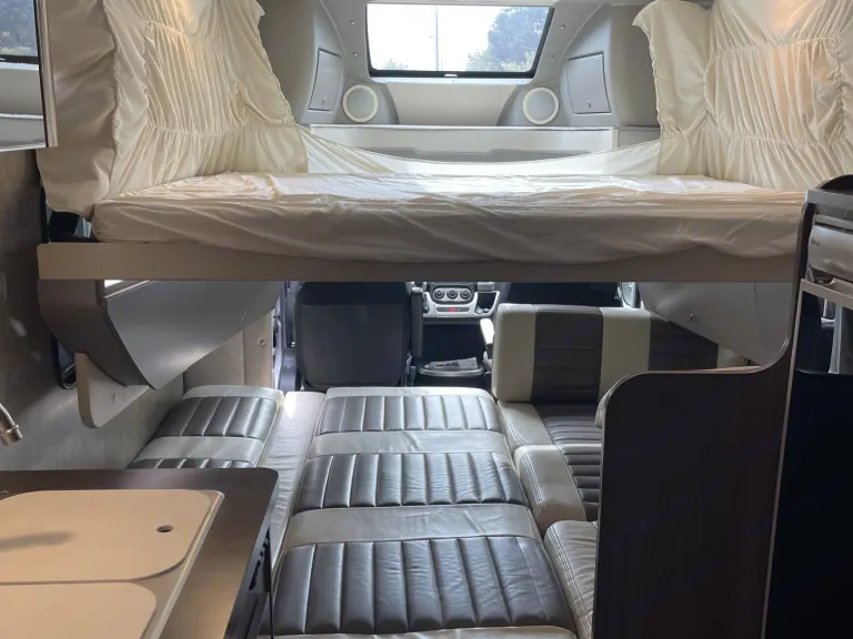 Convertible Living Area: Booth dinette (with three-point seat belts) and a sofa/bed, both featuring soft Ultraleather furniture.