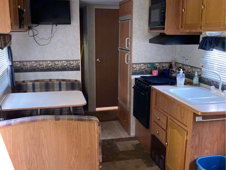 - Queen bed in the front bedroom, twin bunks in the back, fold-out couch, and the dining room table converts to an additional bed.