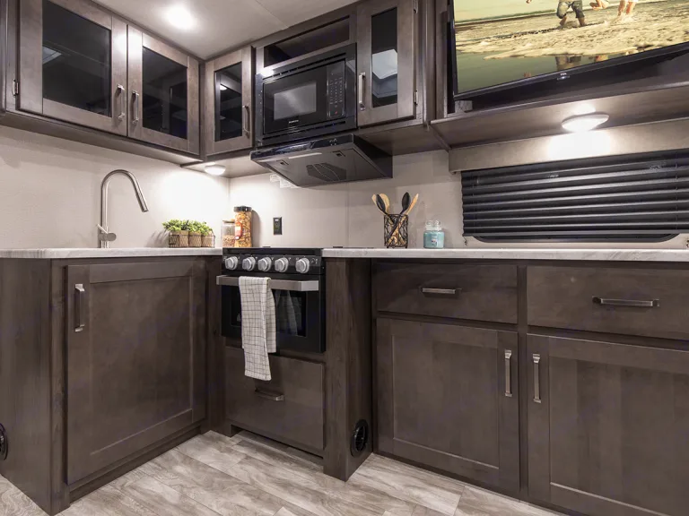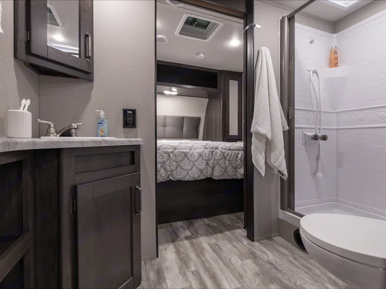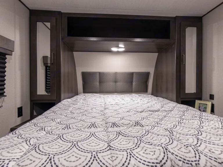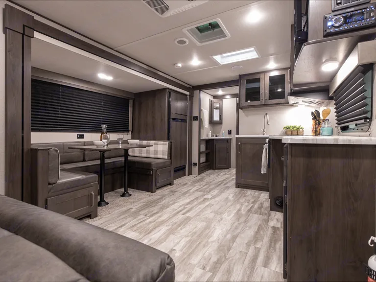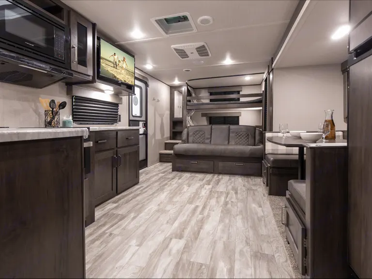 No prying eyes in this travel trailer. With two entries and a flexible bunkhouse, you can enjoy some privacy on the road with family or when entertaining in the spacious living area.Was ist inbegriffen*1 bedding set per bed, pillows.