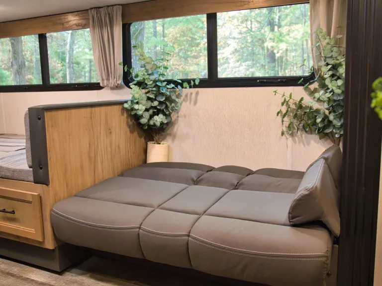 Cozy RV rental interior with comfortable seating, a convertible bed, and large windows revealing a scenic forest view.. Forest River Cherokee Grey Wolf 2023