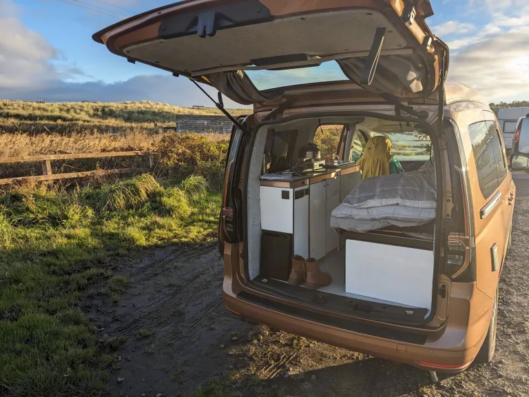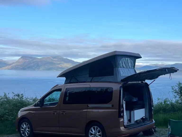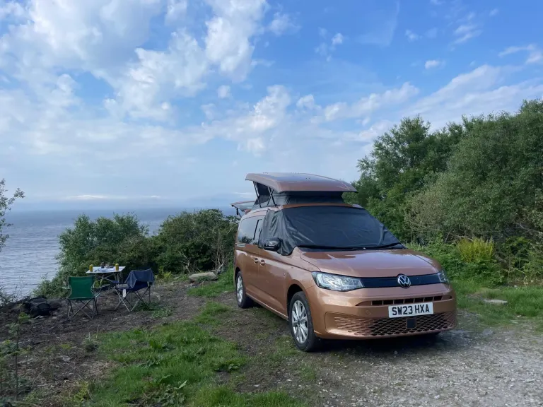 Our lovely little copper camper is the perfect size to explore the NC500 or any of Scotland's tight roads. At less than 5m it fits perfectly in to a normal car parking space. It has 1 double bed, a chest fridge, a little sink and a gas burner stove. The heating is also diesel powered. We will provide all kitchen equipment.