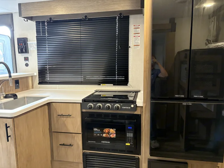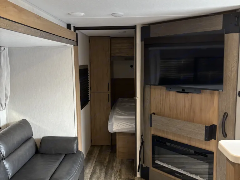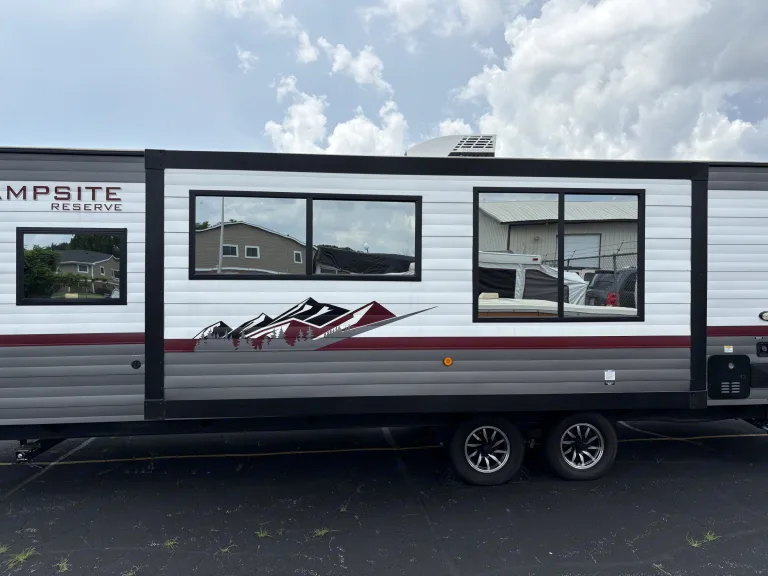 Experience the ultimate in comfort and convenience with the 2024 Forest River Campsite Reserve travel trailer. This thoughtfully designed RV offers a spacious interior featuring a camp king bed, double-size bunks, and a convertible booth dinette, comfortably accommodating up to nine guests. The modern kitchen is equipped with a three-burner cooktop, air fryer, high-rise pull-down faucet with a glass rinser, and a hidden pantry behind the hinged entertainment center, making meal preparation a delight. Enjoy panoramic views through the largest windows in its class, and relax by the cozy electric fireplace. The full bath includes a skylight in the shower for added natural light and headroom. Outside, take advantage of the exterior kitchen with a beverage fridge and grill, as well as mega pass-thru storage for all your gear. Built with the durable TimberStong UltraCore engineered superstructure and featuring a 100-watt solar package, this travel trailer is ready for your next adventure. Book now!