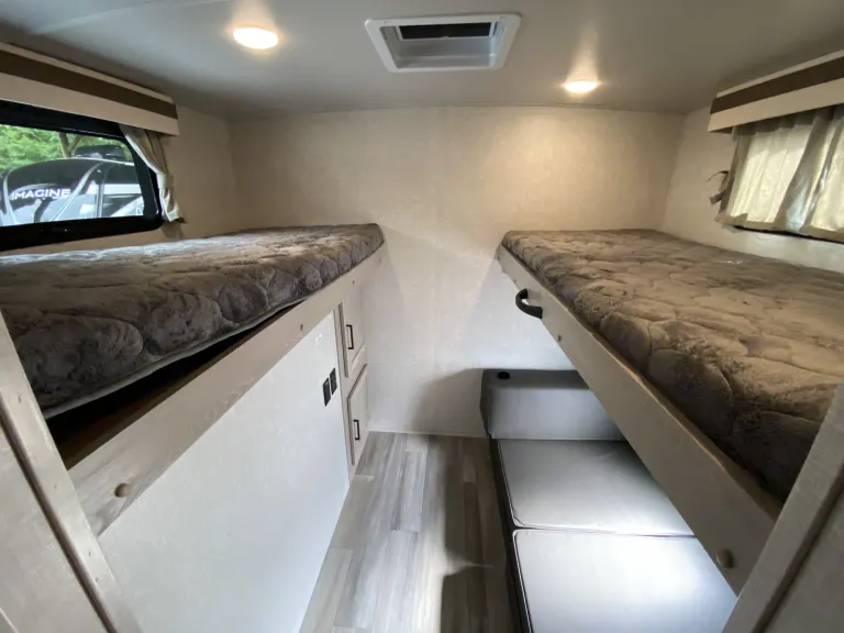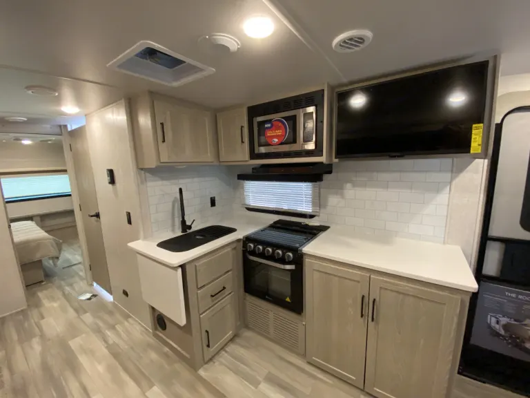 Go camping to explore the outdoors or enjoy the scenery and do it all over again thanks to the comfort of your own trailer at the campsite! The dual entry doors make entering and exiting easy to the private rear bunkhouse with two bunks and a Play Cube sofa. You will find lots of storage in the front bedroom, plus a queen bed slide and the second entry, and the full bathroom has access from the main living and kitchen area. Everyone can relax on the theater seating or U-shaped dinette while the cook uses the L-shaped kitchen area with full amenities to make meals. And the exterior gives you an outside kitchen, a griddle, plus storage including a bike door that allows you to stow things under one of the bunks!