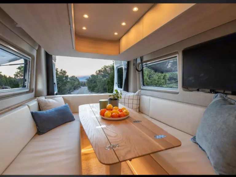 • Dining area converts to a cozy sofa lounge at the push of a button for reading, resting, or streaming