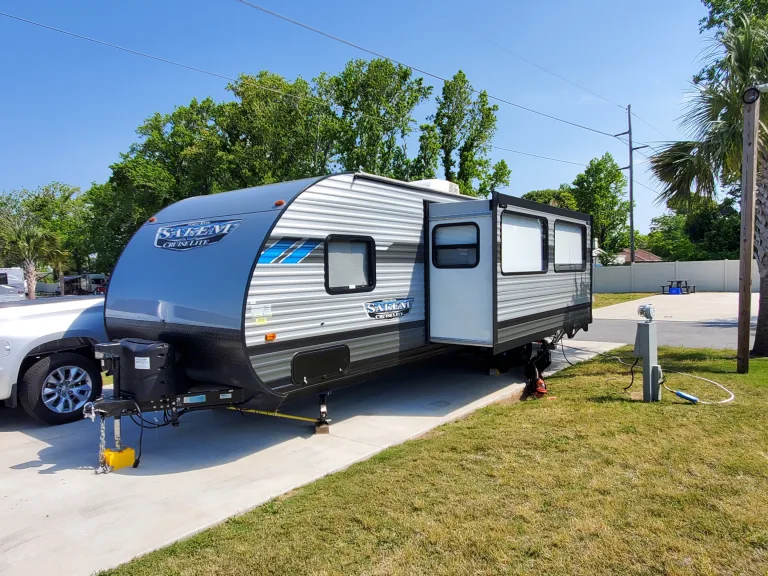 This is a very lightly used 2021 Forest River Salem Cruise Lite. It comfortably sleeps 10 people, and has a dinette and a living room sofa. It is light-weight (5,800 lbs), so it can be pulled by an SUV or a 1500 pick-up truck. It is equipped with the following:Exterior Speakers