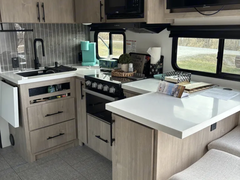 Modern Kitchen: Whip up delicious meals in the well-equipped kitchen featuring a microwave, oven, stove top burner, and a 12V refrigerator.