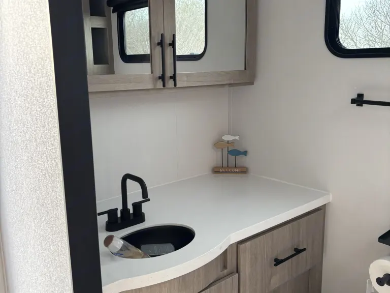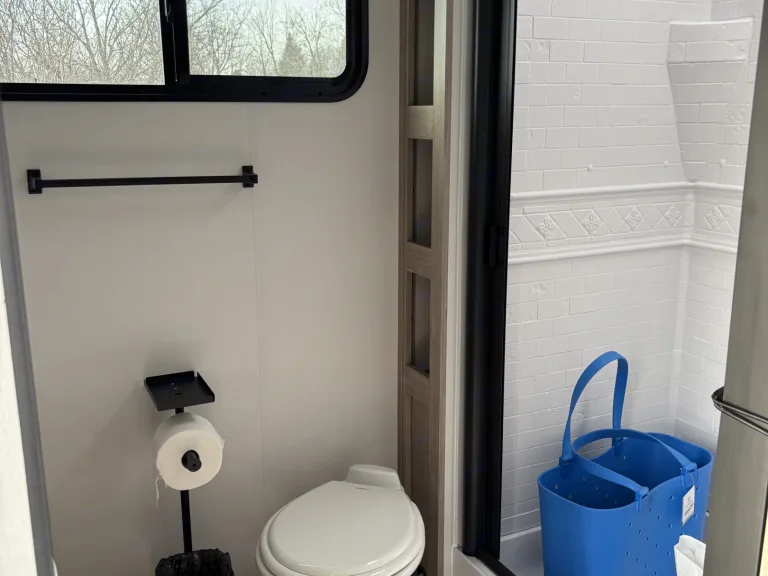 Full Rear Bathroom: Freshen up with ease in the spacious bathroom, featuring a walk-in shower and ample storage.