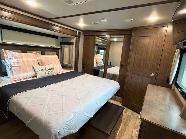 Comfortable RV rental bedroom interior with a large bed, overhead AC, built-in storage, and dresser. Ideal for your next trip.. solitude ST375RES-R 2020