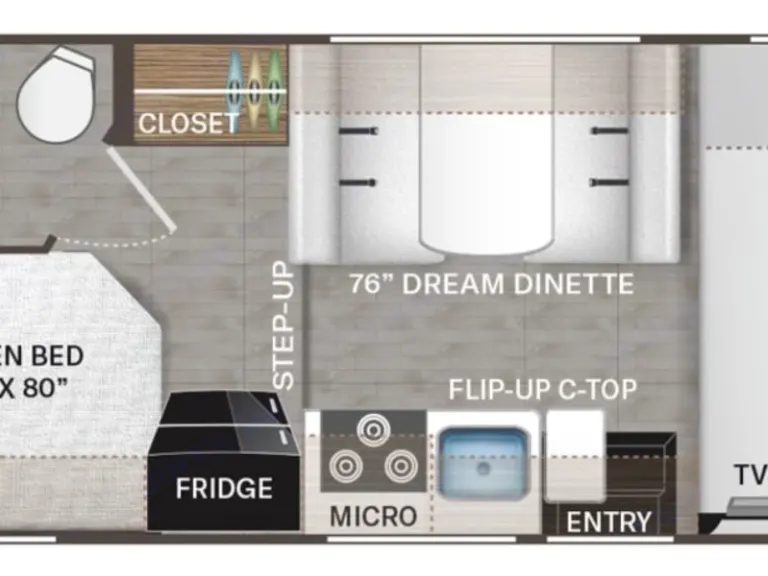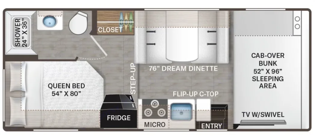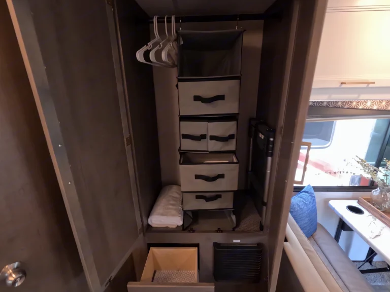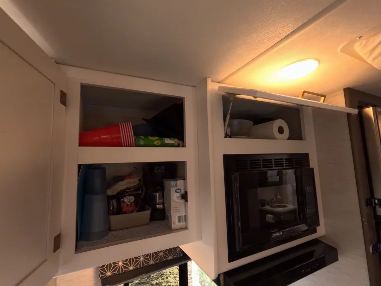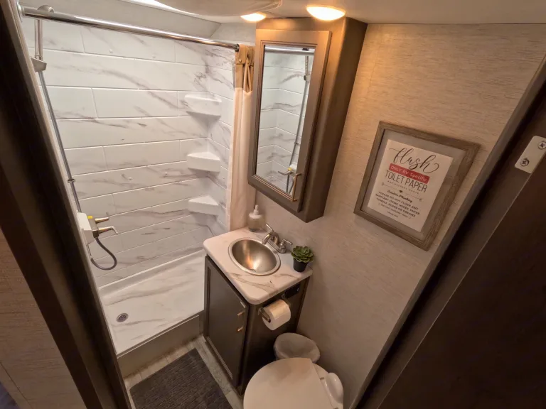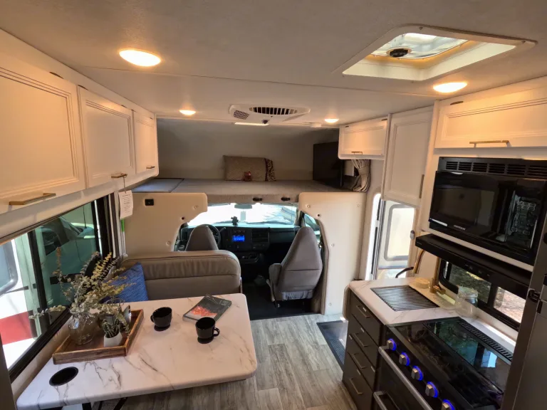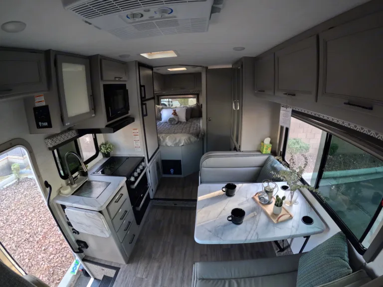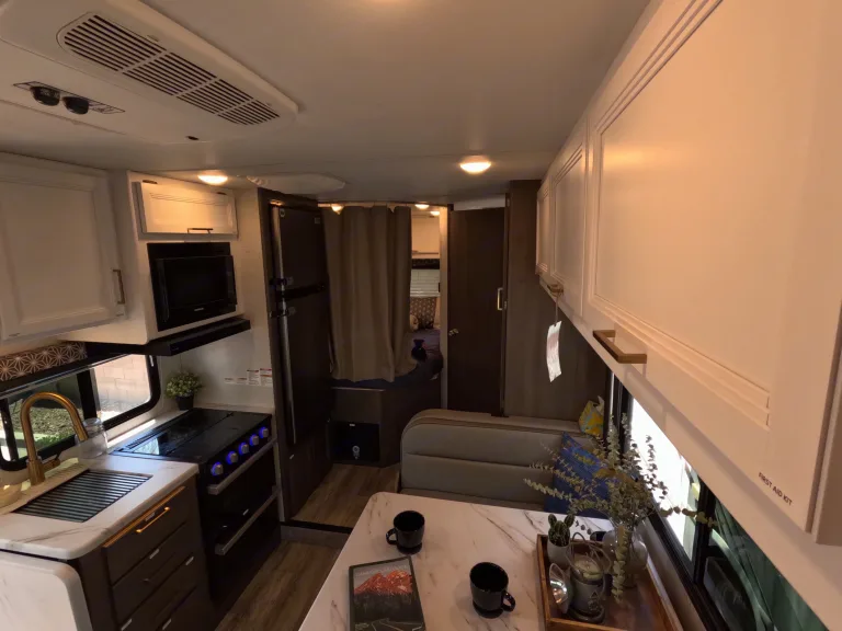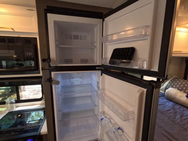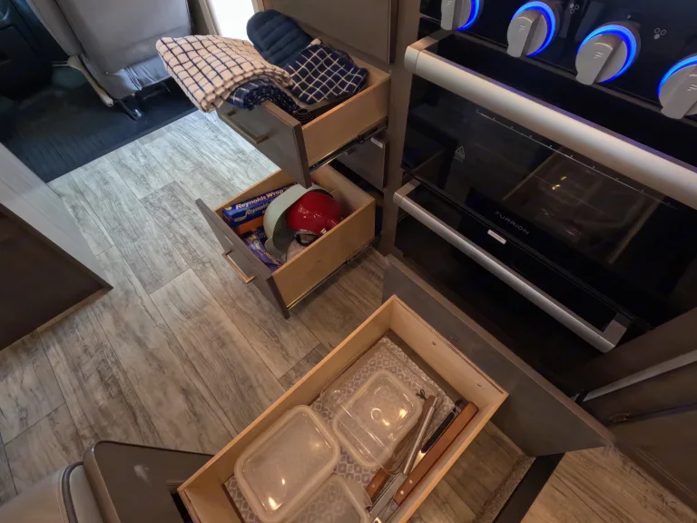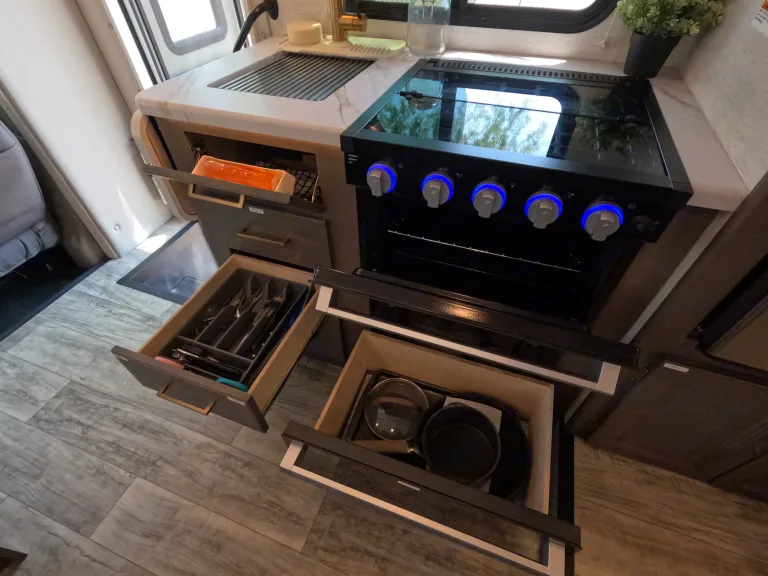 When you’re connected at a campground, everything works like at home. If you’re off-grid, you’ll use the 40-gallon onboard water tank, battery power, and generator for A/C or microwave use.