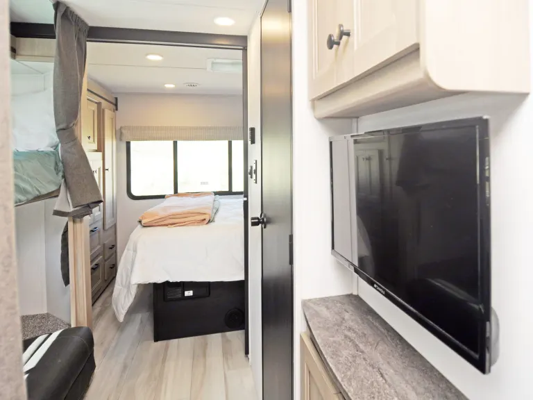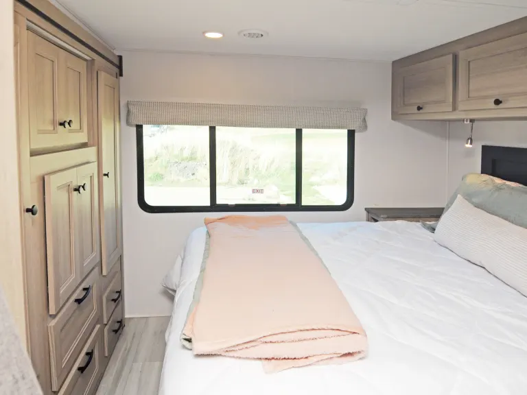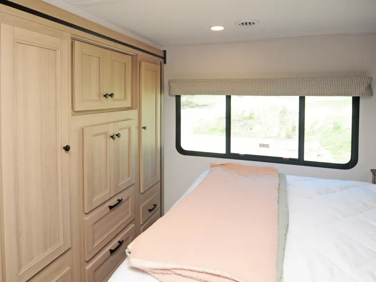 Cozy RV rental bedroom with ample storage, a comfortable bed, and scenic window views. Perfect for your next travel adventure!. Forest River Sunseeker LE 2025