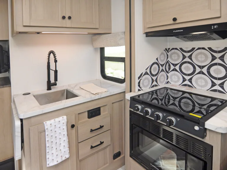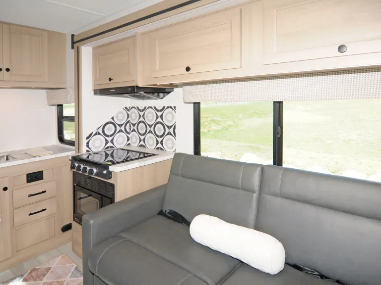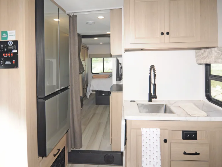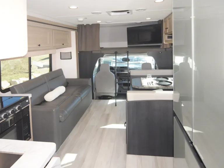 The fully equipped kitchen makes cooking on the road simple and enjoyable. It includes a stovetop, microwave, and large refrigerator, along with pots, pans, dishes, utensils, cooking tools, and a coffee maker—everything you need to prepare family meals wherever your travels take you.