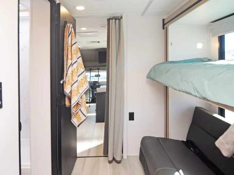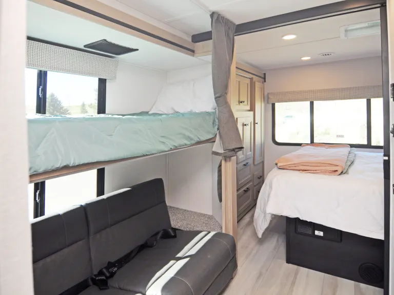 Comfortable RV rental interior with bunk beds, sofa, and main bed, perfect for a family camper trip.. Forest River Sunseeker LE 2025