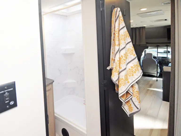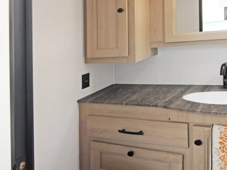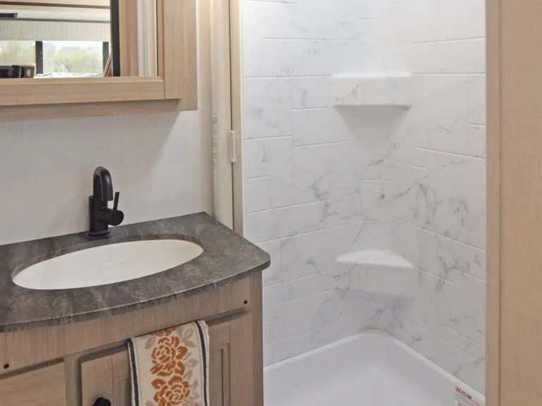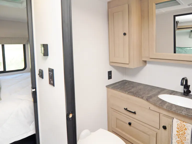 Happy Trails features a private bathroom with a toilet, sink, and shower, giving you all the convenience of home while on the road. Skip the campground bathhouses and enjoy your own clean, comfortable space. Toilet paper and RV septic tabs are included for your convenience.