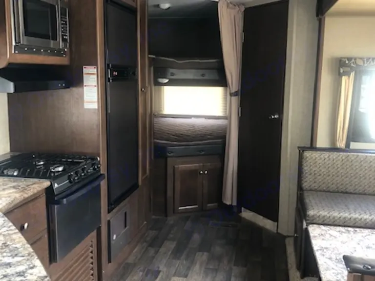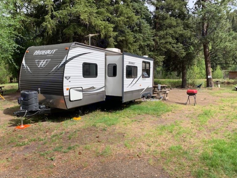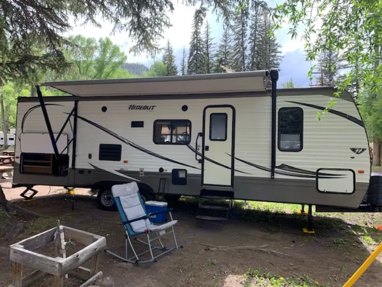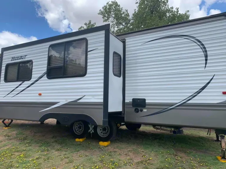 Hideout is clean family style camper with a queen bed in the master and 2 bunk beds that are full size on the opposite side of the trailer with tons of storage throughout the camper. A full kitchen with fridge, a convertible couch and a convertible booth table area. Spacious bathroom with toilet, shower, and sink. Tv's with DVD players and a indoor/outdoor stereo. A/C and heater. Electric awing and trailer stabilizers.**Delivery and pickup within 100mi radius available.**Must be 25yrs. old of age**