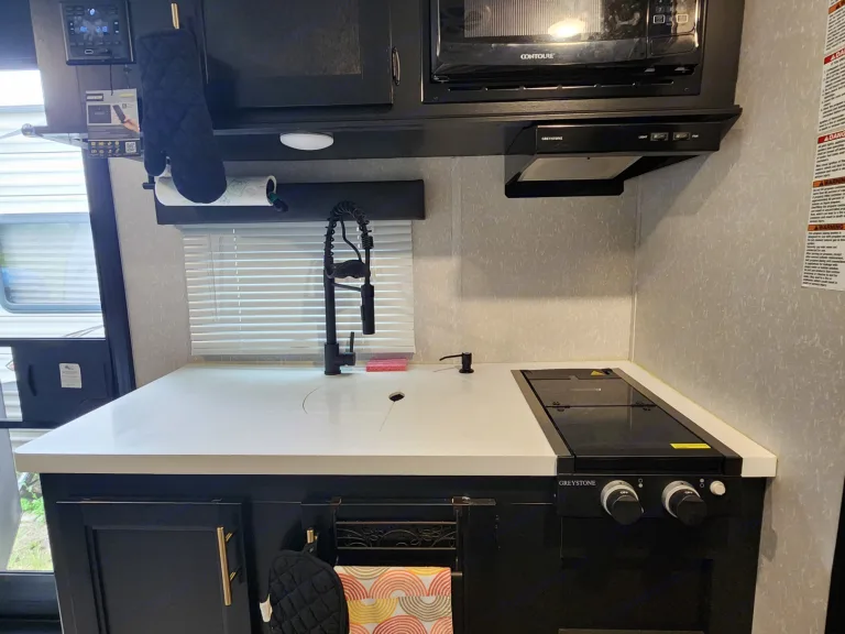 This smaller sized Travel Trailer looks and feels great on the road. This TT comes well equipped for a weeks adventure being able to house up to 6 people and enough room to move around comfortably inside. The trailer is equipped with a propane tank, 150W solar panels to assist with charging the battery during the day, and a mini prep table to grill (portable grill provided) outside those beautiful days. The AC is perfect for those hot days and a choice between the gas heater or a 110v heater for those cold ones.Delivery is possible too! Just notify me before your pickup date.
