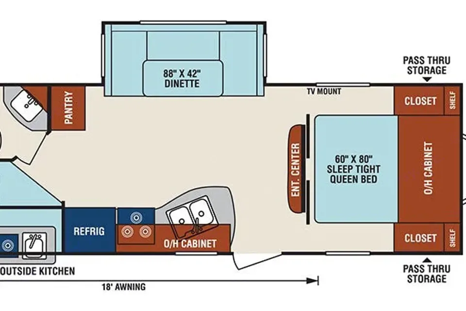 The Sporttrek by Venture which is 28ft long from bumper to tongue, is a delight there is lots of storage space and comfortable contemporary décor to make your trip a relaxing one.With large bunkbeds and a queen bed in its own private room with privacy doors on both sides, all mattresses have protectors on. The U shaped dinette also converts into a bed for nighttime. So all the creature comforts have been taken care of.It has a pop out so space is no problem, room for 5 to sleep and a large shower, sink and porcelain toilet in the bathroom.