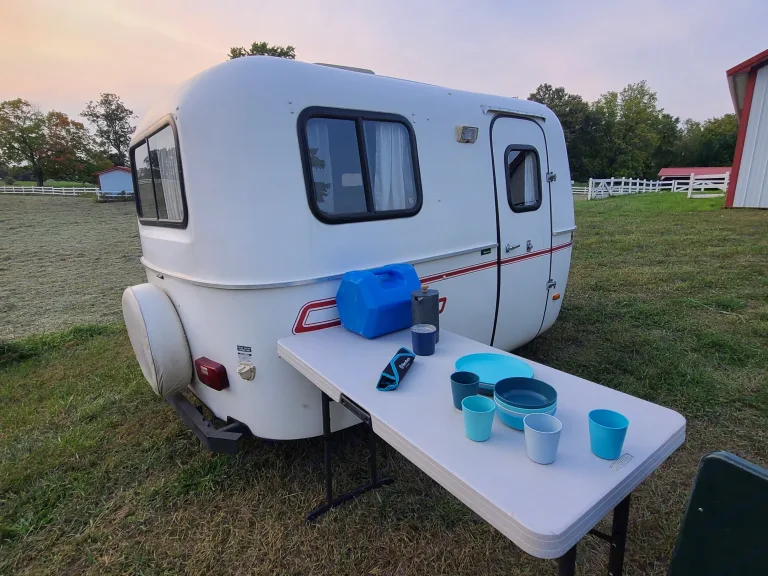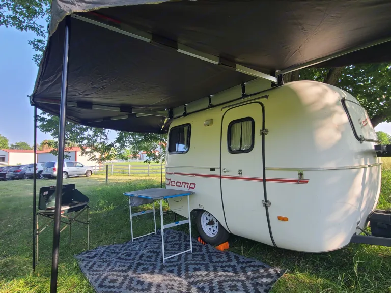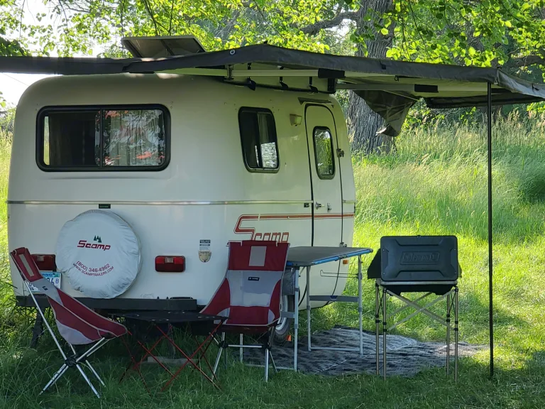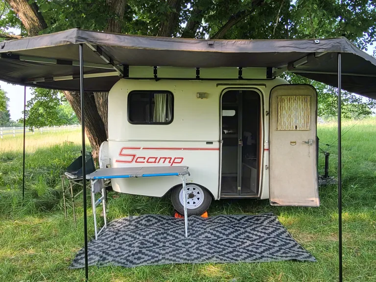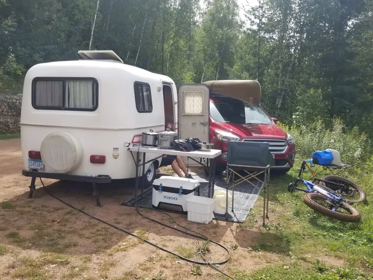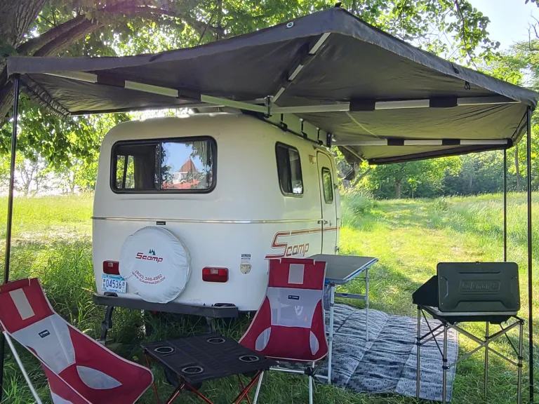 EmpfehlungenGo explore the great outdoors, find nooks and crannies of this great region.Prior to turning the Scamp into a rental unit, I've mostly enjoyed the Scamp on friends' plots of land, in the Chippewa and Superior National Forests, Bluff Country, and in some State parks throughout the upper mid-west region.Weitere wichtige DingeThis trailer does not have a bathroom nor any black/gray water holding tanks.City water can be connected, but the sink drains directly outside (to a catch pail) not to gray water tank.The Scamp is about as easy as it gets; not only while setting up and camping, but aslo when in comes to towing and backing into a camp site.270 degree awning creates great shade and rain protection.