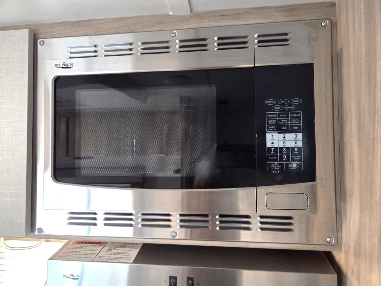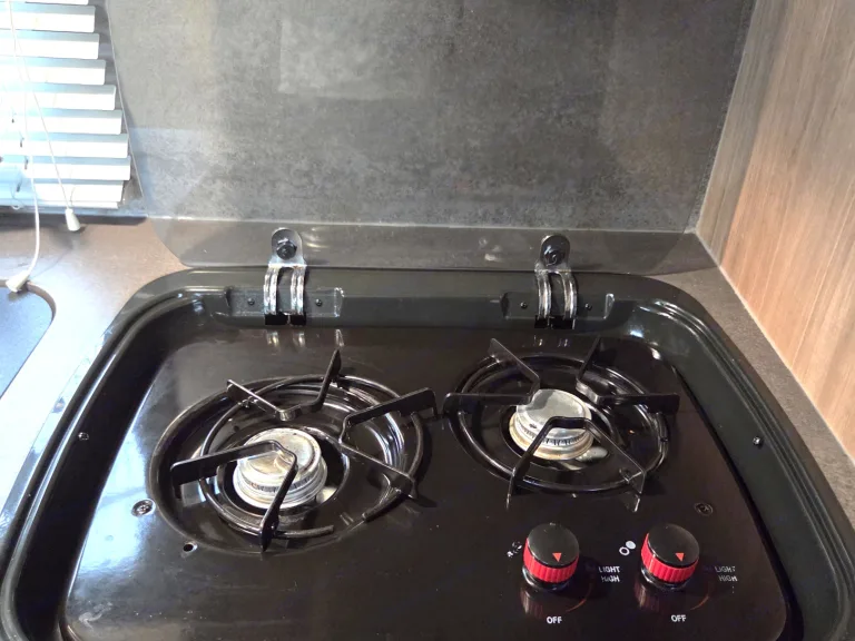 • Full Kitchen: Two-burner cooktop, microwave, fridge/freezer, and plenty of storage for campsite feasts.