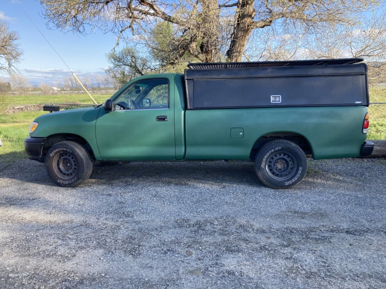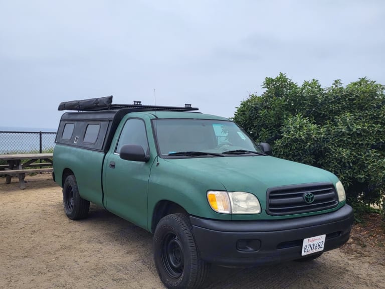 Green Machine is an ol’ reliable 2000 Toyota Tundra Manual Transmission with 8’ bed and camper shell. It’s equipped with a heavy duty roof rack for paddle boards, kayaks, bikes, surfboards, etc. It also has an awning for shade and chill-time.