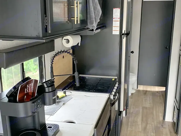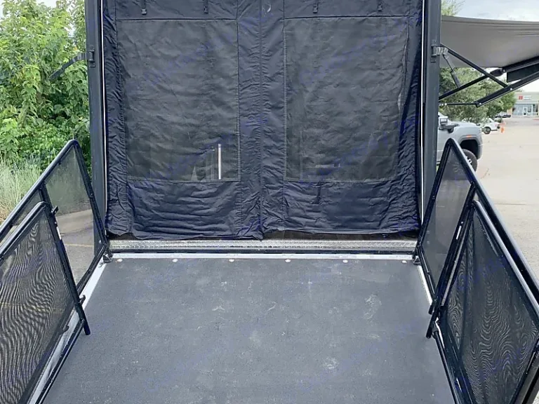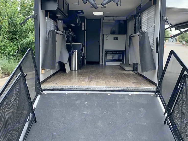 Enjoy year-round comfort in this toy hauler, featuring a full kitchen and hot showers.