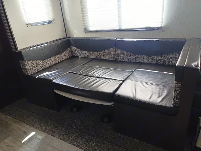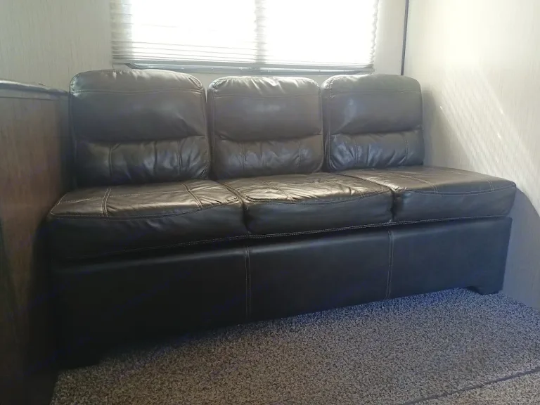 Dark faux leather sofa, likely a sleeper, in an RV rental. Features a window with blinds above and carpeted floor.. Heartland RVs Prowler 2021