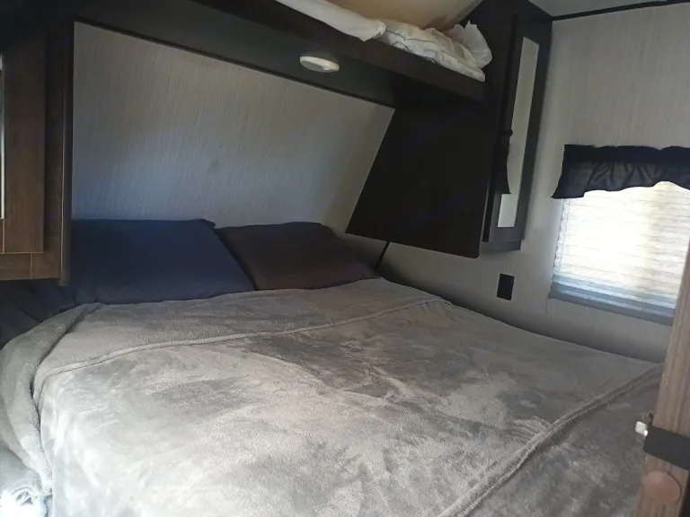 Compact RV rental bedroom featuring a comfy bed, pillows, overhead cabinets, and a window with blinds.. Heartland RVs Prowler 2021