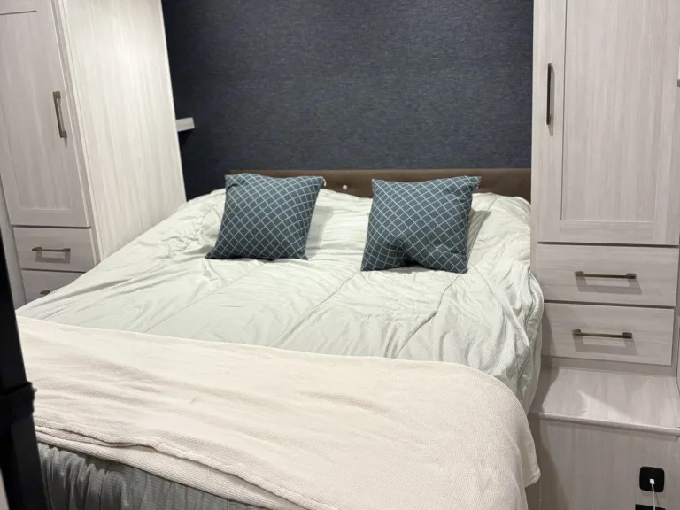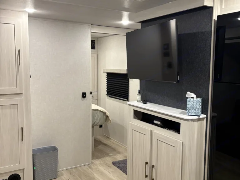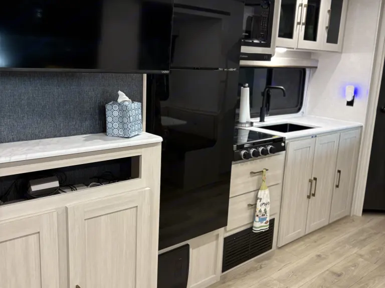 Includes a 3-burner stove, microwave/Convection oven/Air Fryer, and a refrigerator/freezer. Everything you need to cook your favorite meals on the road.Full Bathroom