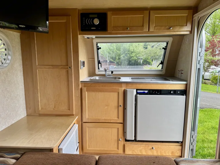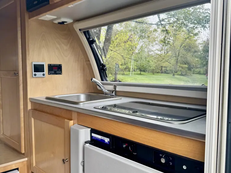 Meet Your Adventure-Ready Teardrop Trailer!Looking for the perfect companion for your next road trip? Meet my charming 2016 T@B teardrop trailer- lovingly nicknamed Gus! This trailer is small in size but BIG on adventure. The space is cozy, cool (or warm!), and fully equipped to take your camping game to the next level!This trailer comfortably sleeps two as the seating area converts to a sleeping space. Four adults can sit around the dining area comfortably- perfect to share meals or evade a tricky weather day playing games. Screened windows keep the critters out and blackout shades ensure the best sleep possible.Stay toasty with the heater or cool off with the ceiling fan and cooling unit. Need a rinse after a hike? This trailer has you covered with an outdoor sprayer! The kitchen has a sink, two-burner gas stove, mini fridge, and all basic cooking utensils so you can whip up a campsite feast.Entertainment? You bet. Gus is fitted with a TV/DVD combo, Bluetooth sound system, and radio—perfect for winding down under the stars.Lightweight and easy to tow, Gus is ready to roll wherever your wanderlust takes you. Pack your bags, hit the road, and make memories—book today!Gus is most conveniently enjoyed when booked at a campsite with water and electrical hookups. It makes camping an absolute breeze! If you are camping without hookups, please let me know so I can prepare the camper instructions for that scenario. Battery life can sustain most features of the camper for a limited time.*Please note that the interior height is 5.75 feet.*Was ist inbegriffenFull propane tank
