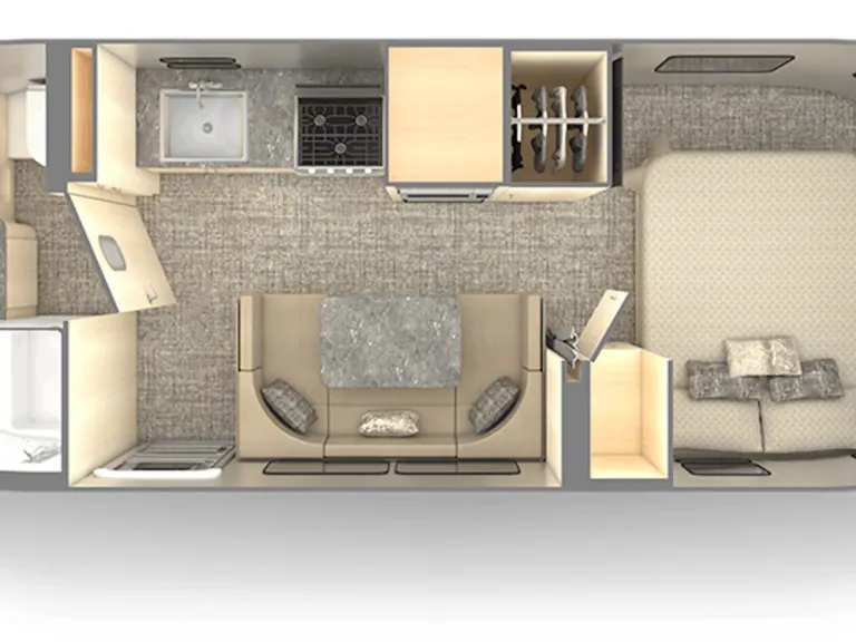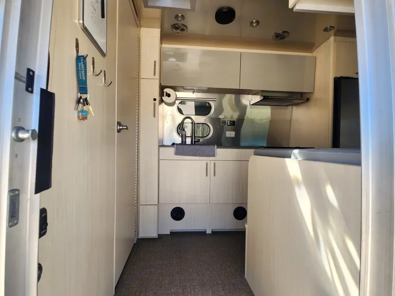 - Step inside and be greeted by a stylish and cozy interior that exudes a sense of luxury and adventure. The open living space features comfortable seating, a well-equipped kitchenette, and a dinette that quickly converts into a sleeping area.