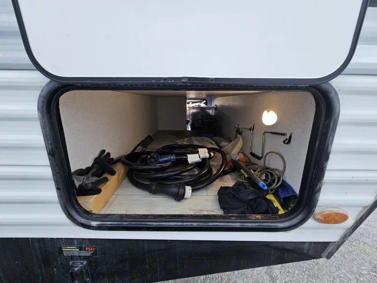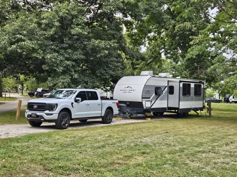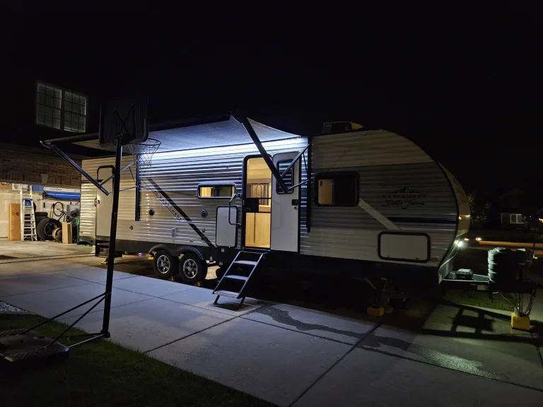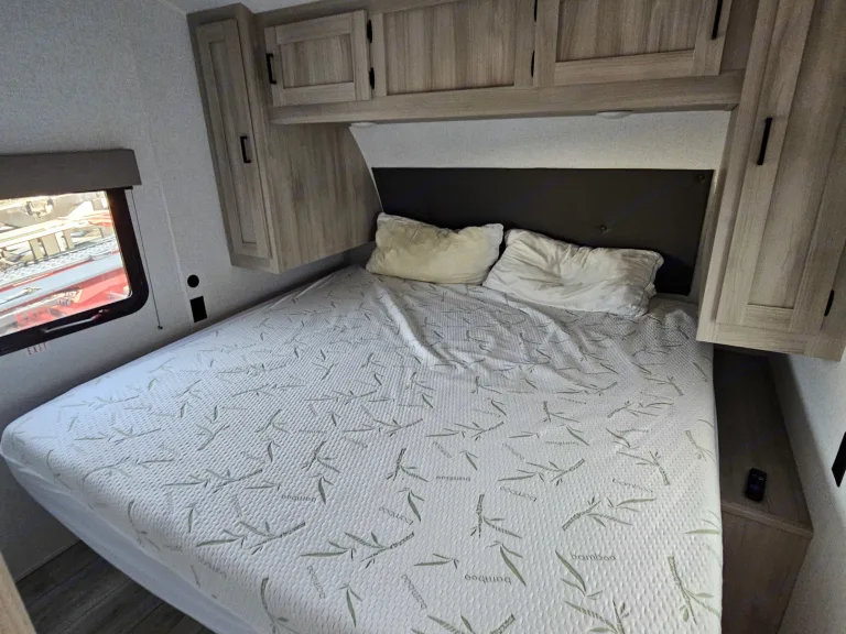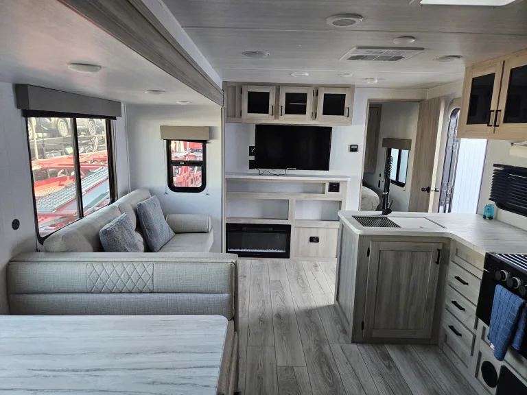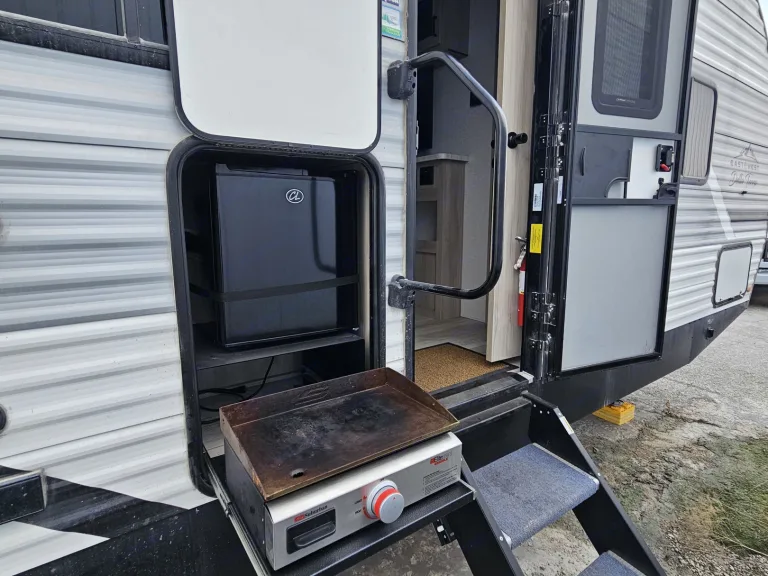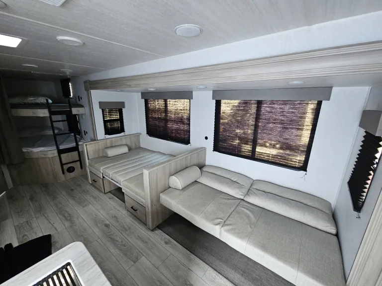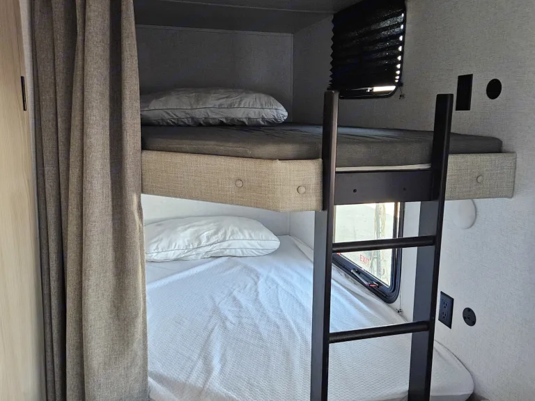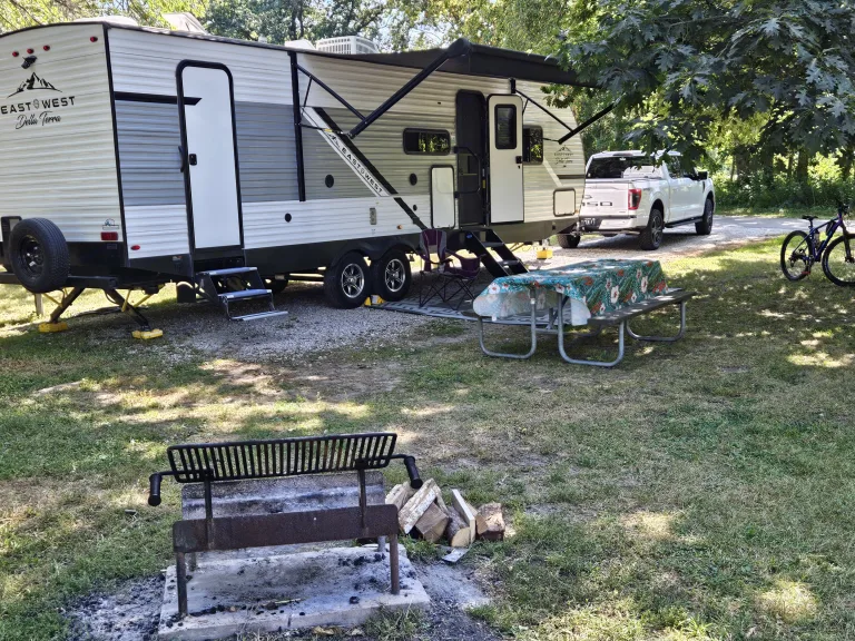 Great big family travel trailer! Sleeps 8-10 people. Closed off master bedroom with a door for your privacy. Master bedroom has King Size BED!!! and TV . Spacious bunk beds. Dinette converts to bed, jackknife sofa bed. Outside kitchen ( Grille and outside fridge). Main living area with electric fireplace and big TV and audio system. Home size refrigerator. Large pantry . Toilet, shower and more...Was ist inbegriffenWeight distribution hitch, 4 camping chairs, utensils, dishes, pots and pans, bedding, towels.EmpfehlungenOur favorite spots: Holland State Park, MI , Devil's Lake, WI, Starved Rock, IL, Ilini State Park, IL, Indiana dunes, IN ...Weitere wichtige DingeNo smoking inside.