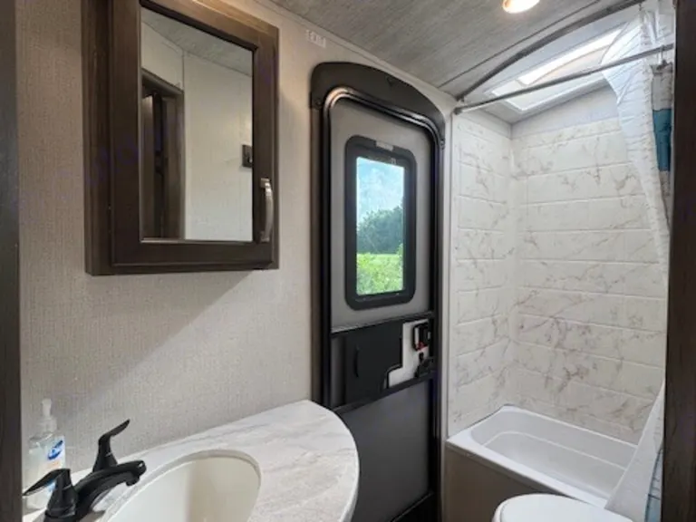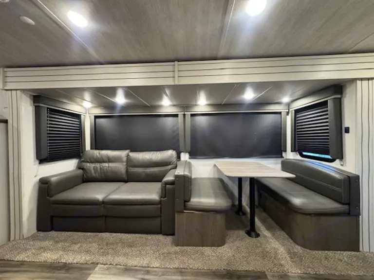 Outside there is an electric awning with LED lights storage compartments and just push one button to auto level the whole RV. You are guaranteed to enjoy your camping trip in this RV.