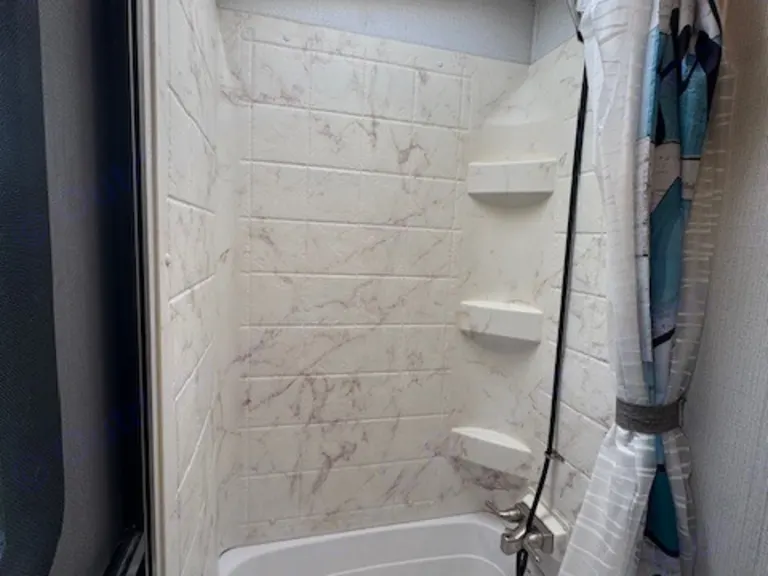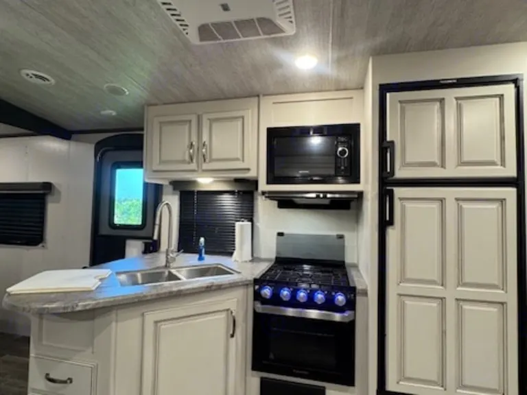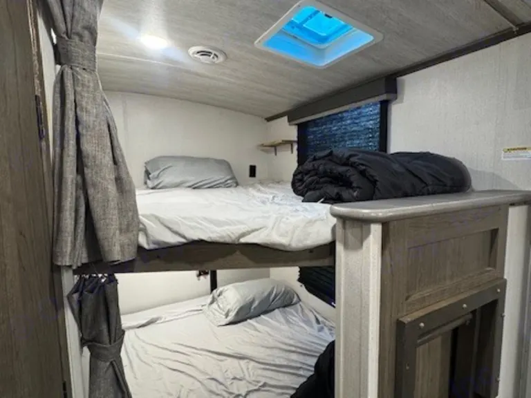 The Cougar is excellent for camping and has everything you need to have a great time. Two door entry, Two A/C, 34’ 1” long, weighs 7008 lbs. dry weight, and has Auto Leveling. When you come in the front door you are in the living area and if you take a sharp right, you are in the mail bedroom with a King Walk around bed, a closet on each side of the bed is for hanging cloths. The living area has a 40” TV, Fake Fireplace that gives heat if needed, Sofa That can make a bed, and a AM, FM, Radio with Blue tooth. Looking toward the back there are Two large double bunks and to the left is the full bathroom with a tub shower, sink with vanity, toilet and an entry door.