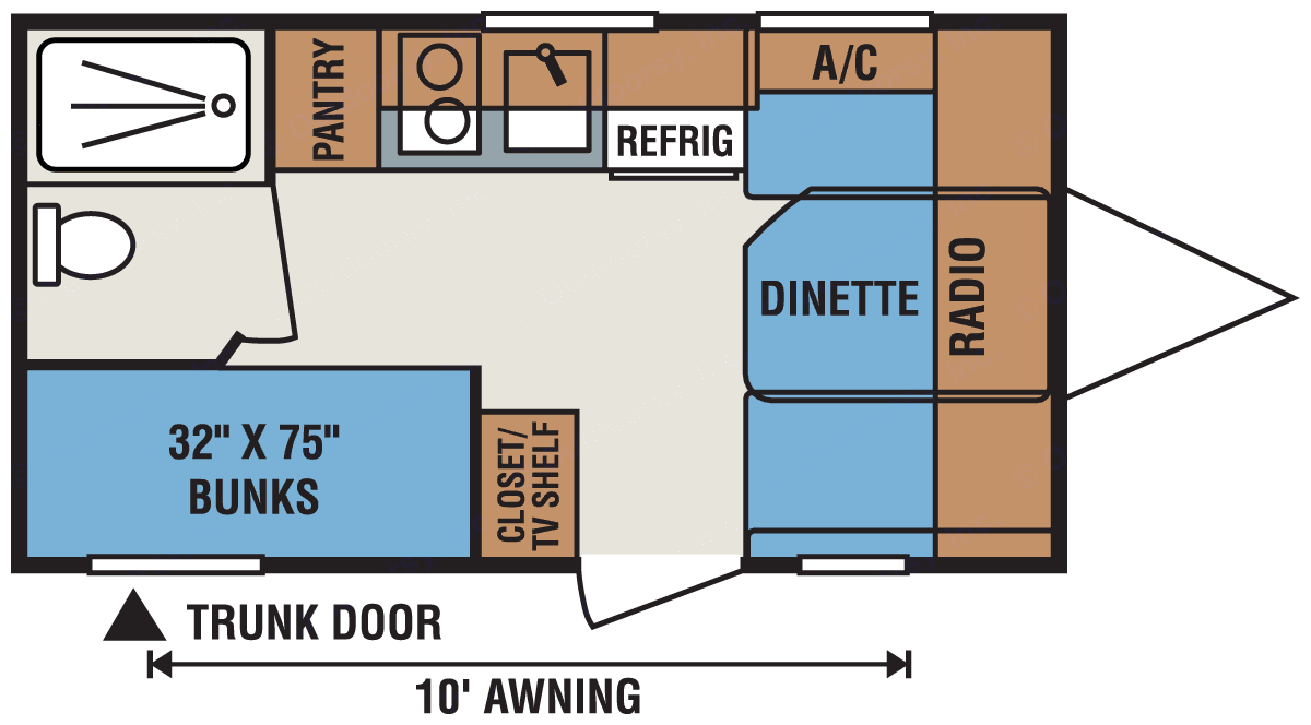 Our 2010 trailer is in very good condition and sleeps 4. It is fully equipped with a dinette that converts to a queen size bed, a set of bunk beds, propane stove, refrigerator with freezer box, kitchen sink, kitchen counter for food preparation, microwave, and awning.