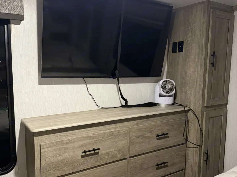 RV rental bedroom showing a wall-mounted TV over a wooden dresser, storage cabinet, and bed with white comforter.. Forest River Salem Hemisphere 2022