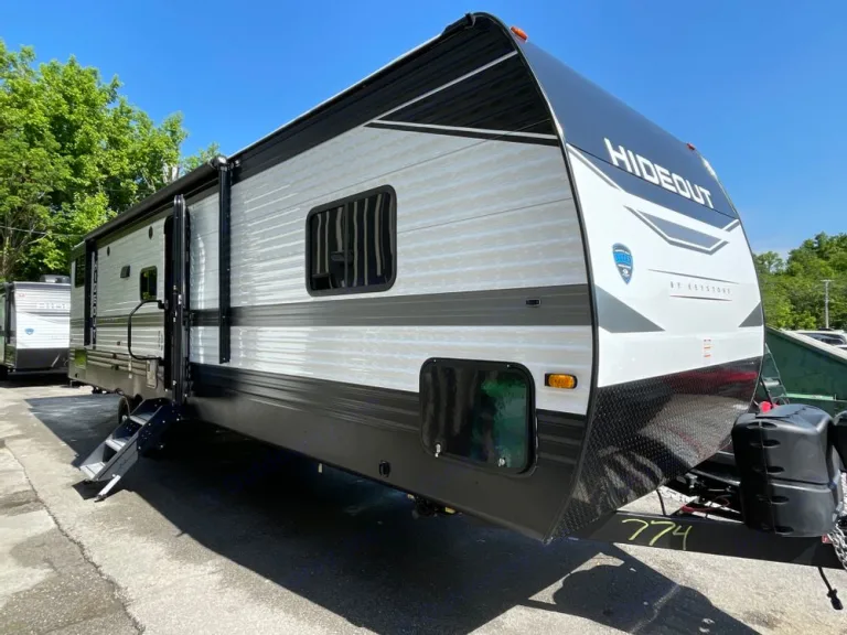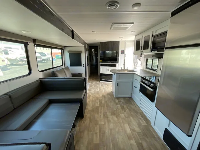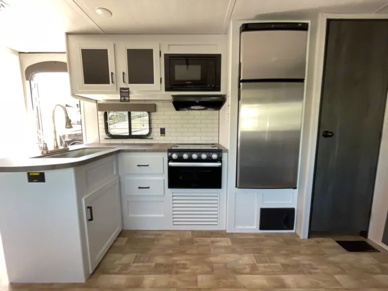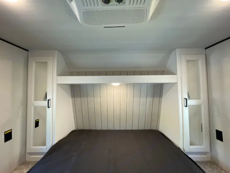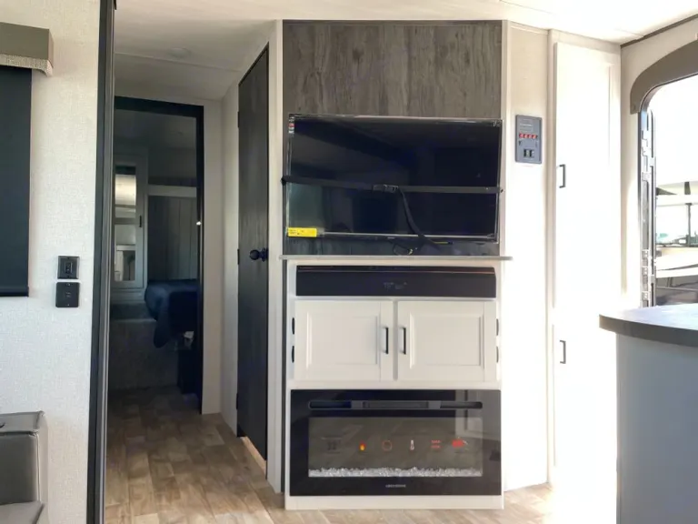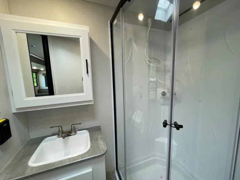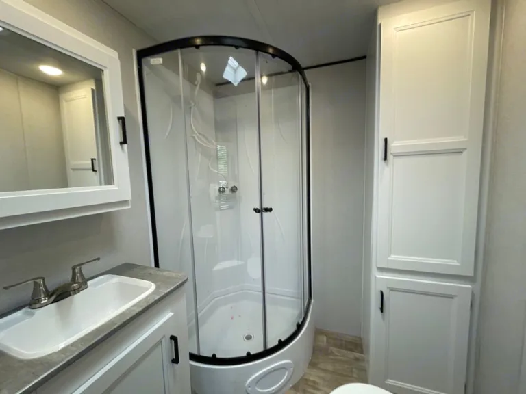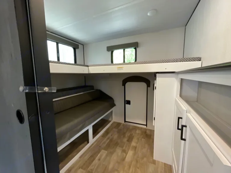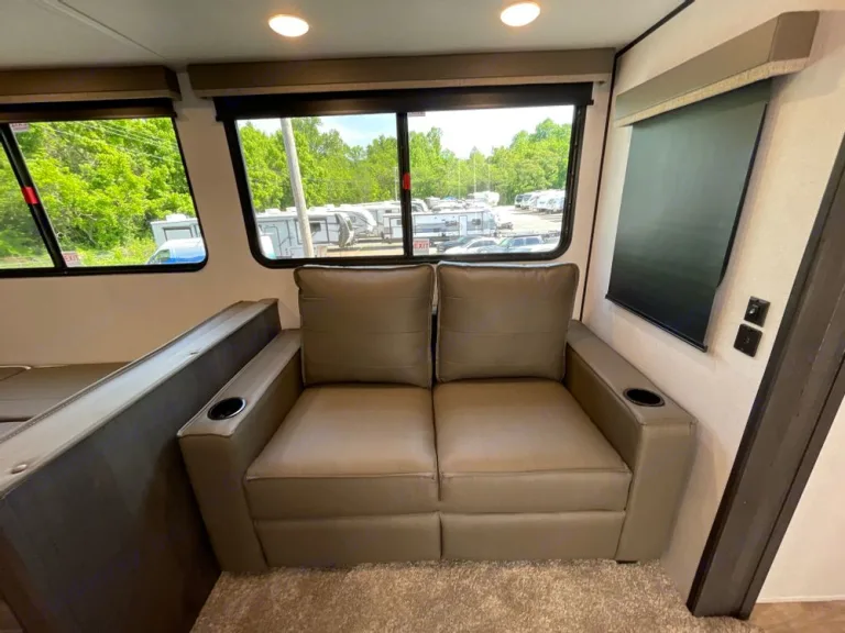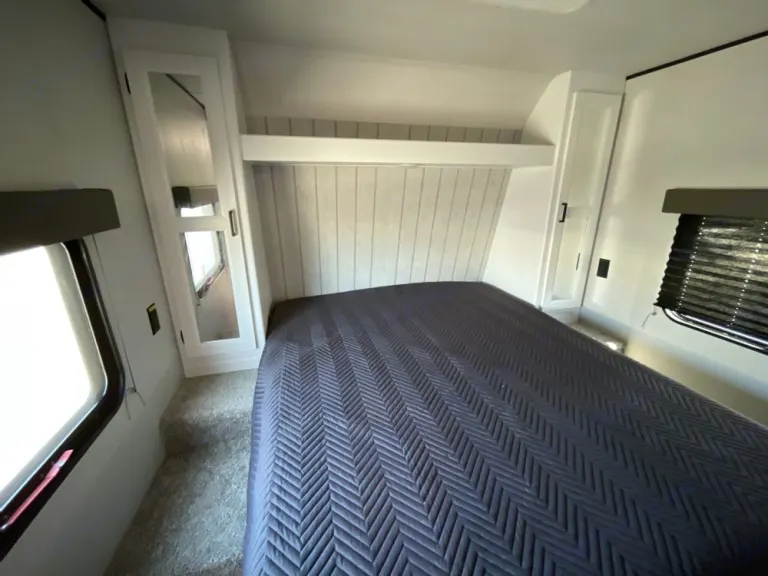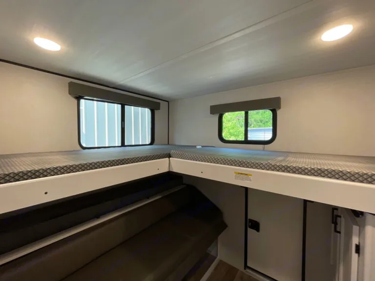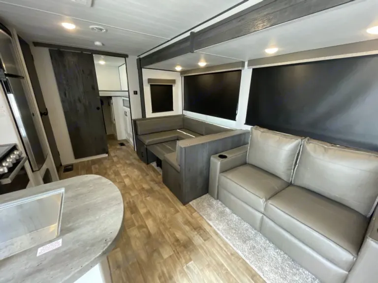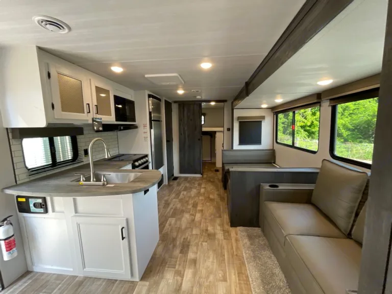 Room for family and friends! This brand-new unit 50-amp unit features a spacious main bedroom with single door entry and laundry chute leading to front pass-through storage area, a large bathroom with sliding glass shower, a large slide with pull out couch and sleeper-dinette, an open kitchen with plenty of countertop space and large refrigerator, a pantry that doubles as a clothes closet, and finally a spacious rear bunk room with two fold-down L-shaped bunks with a couch that pulls out into a queen bed. This unit is also equipped with two A/C units (one for main bedroom and one for the rest of the unit), a Bluetooth enabled stereo with inside/outside speakers, an awning with LED strip, an outdoor hot/cold shower, solar panels, power tongue jack, and power front and rear stabilizers. Was ist inbegriffenWe will include towels, linens, assorted cleaning products and other random items to help make your trip more fun! Weitere wichtige DingePets allowed. I am fine with you bringing pets, however, please do not allow them on the furniture.Waste removal fee of $50 will be added to empty tanks if your site does not have sewer hook-up. Please select this in the add-ons section.No smoking in the unit. If smoking outside, please ensure the doors and windows are closed.Delivery only - delivery fee is $2.50 per mile with $100 minimum. Please input your dates to see delivery fees associated with your trip.