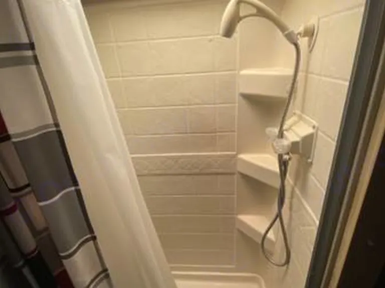 - Full bathroom with separate shower and an expansive shower curtain and skylight for big/tall people.