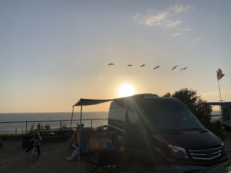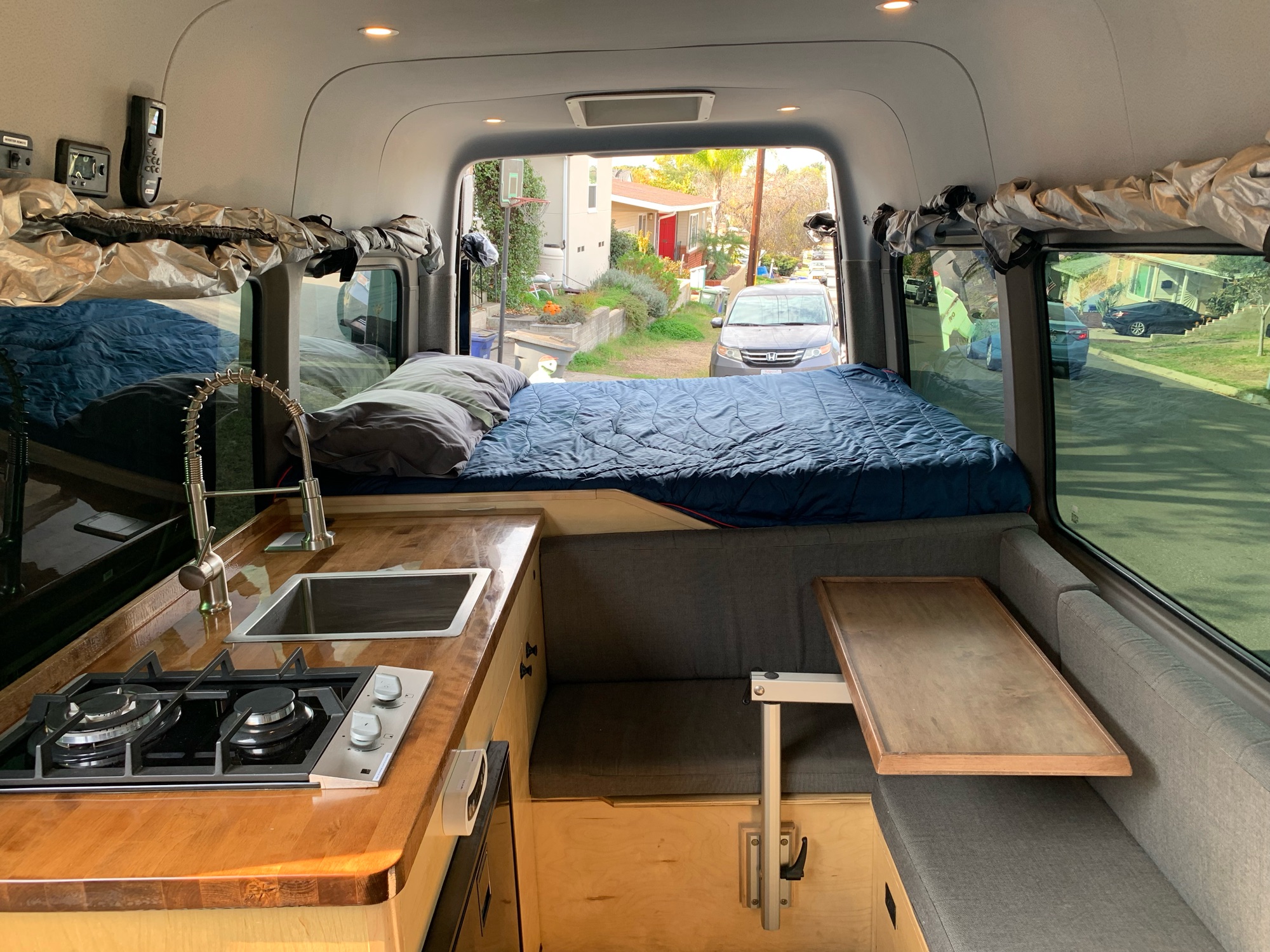 We have accommodations for up to 7 people. 5 people inside the van and 2 people outside in a tent! 2 adults can sleep on the memory foam queen bed inside the van. 1 adult and 1 child can fit on the second memory foam bed in the dining area. One adult or one child can fit on the blow up mattress for the front cab. 2 adults can sleep in the REI half dome tent with hest sleep mat (like a memory foam mattress).