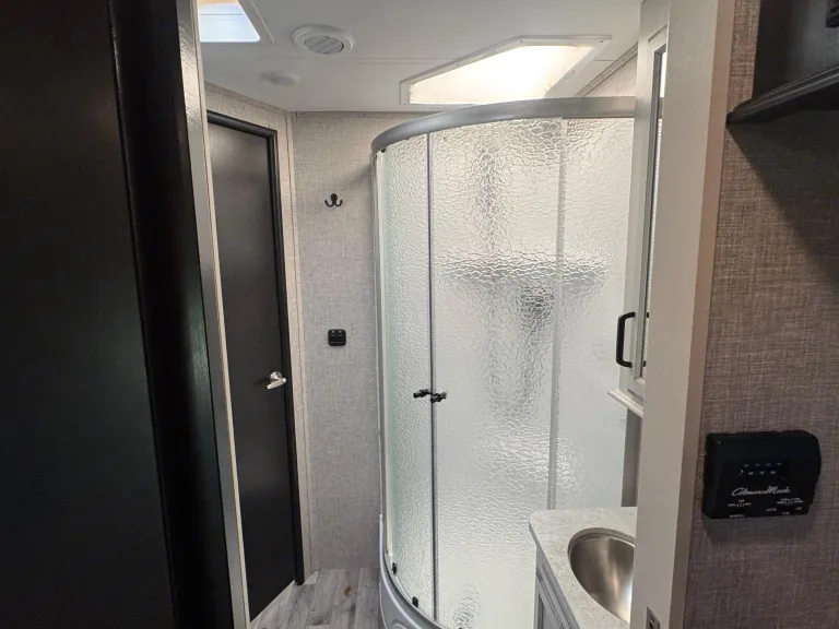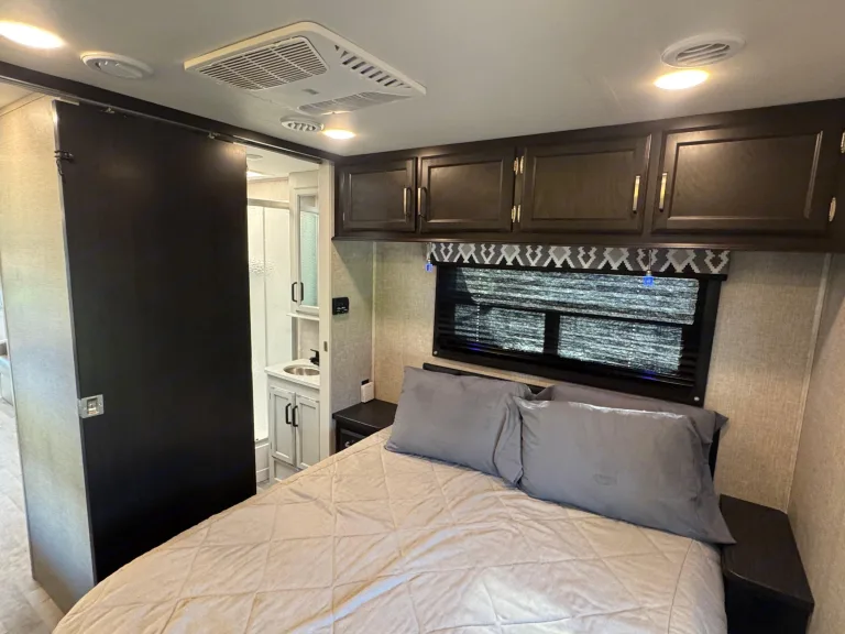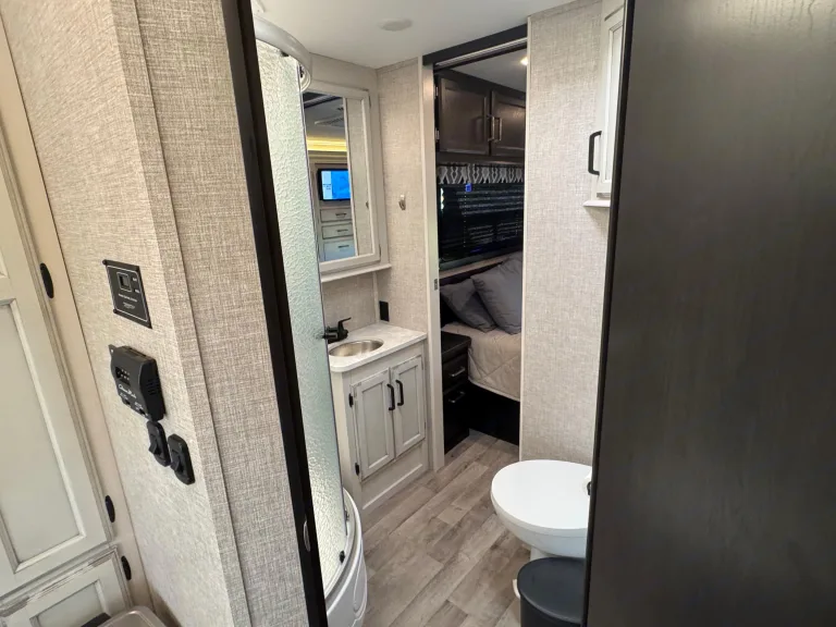 freezer, and plenty of space . The bathroom has a full shower, toilet, area with access from rear bedroom as well as the hallway. Complete slide out on the driver side. Backup camera, side camera, Dual AC Units, Solar Panel,